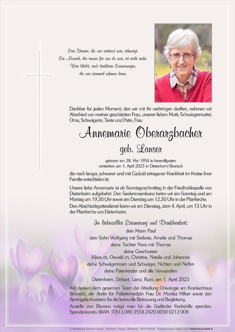 Anstelle von Blumen möge man für die Südtiroler Krebshilfe spenden.