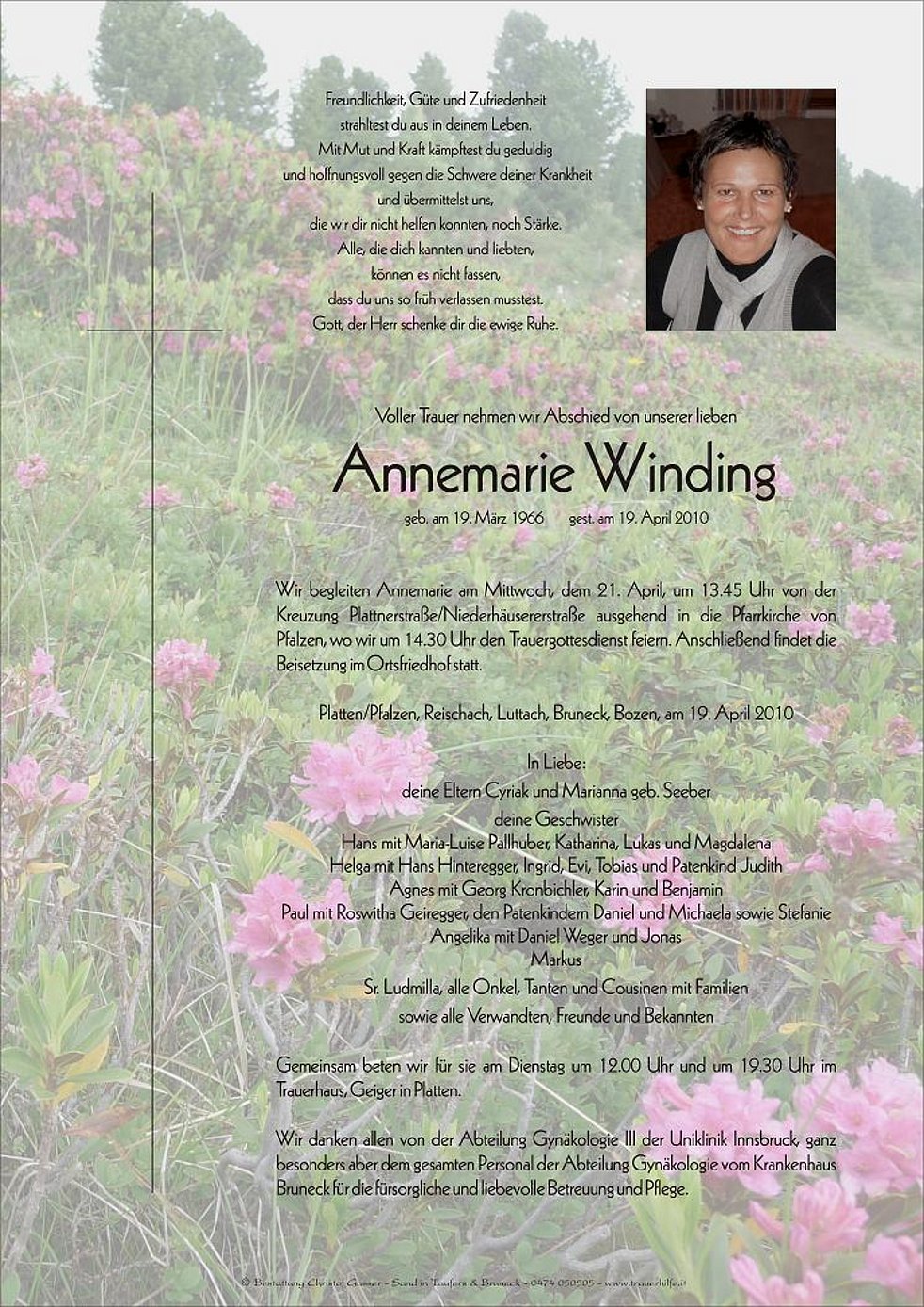 Wir begleiten Annemarie am Mittwoch, dem 21. April, um 13.45 Uhr von der Kreuzung Plattnerstraße/Niederhäusererstraße ausgehend in die Pfarrkirche von Pfalzen, wo wir um 14.30 Uhr den Trauergottesdienst feiern. Anschließend findet die Beisetzung im Ortsfriedhof statt.