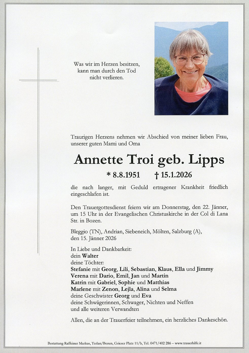 Den Trauergottesdienst feiern wir am Donnerstag, den 22. Jänner, um 15 Uhr in der Evangelischen Christuskirche in der Col di Lana Str. in Bozen.