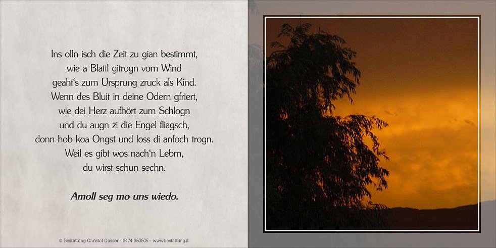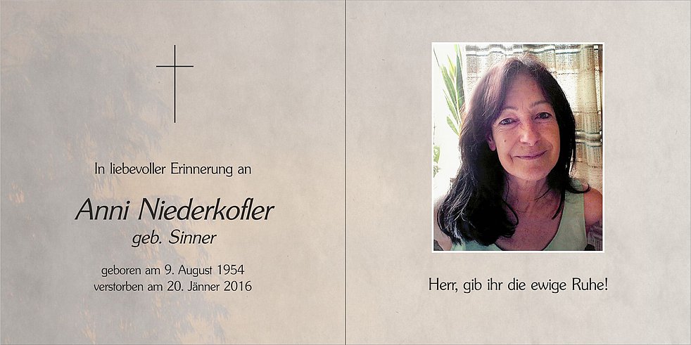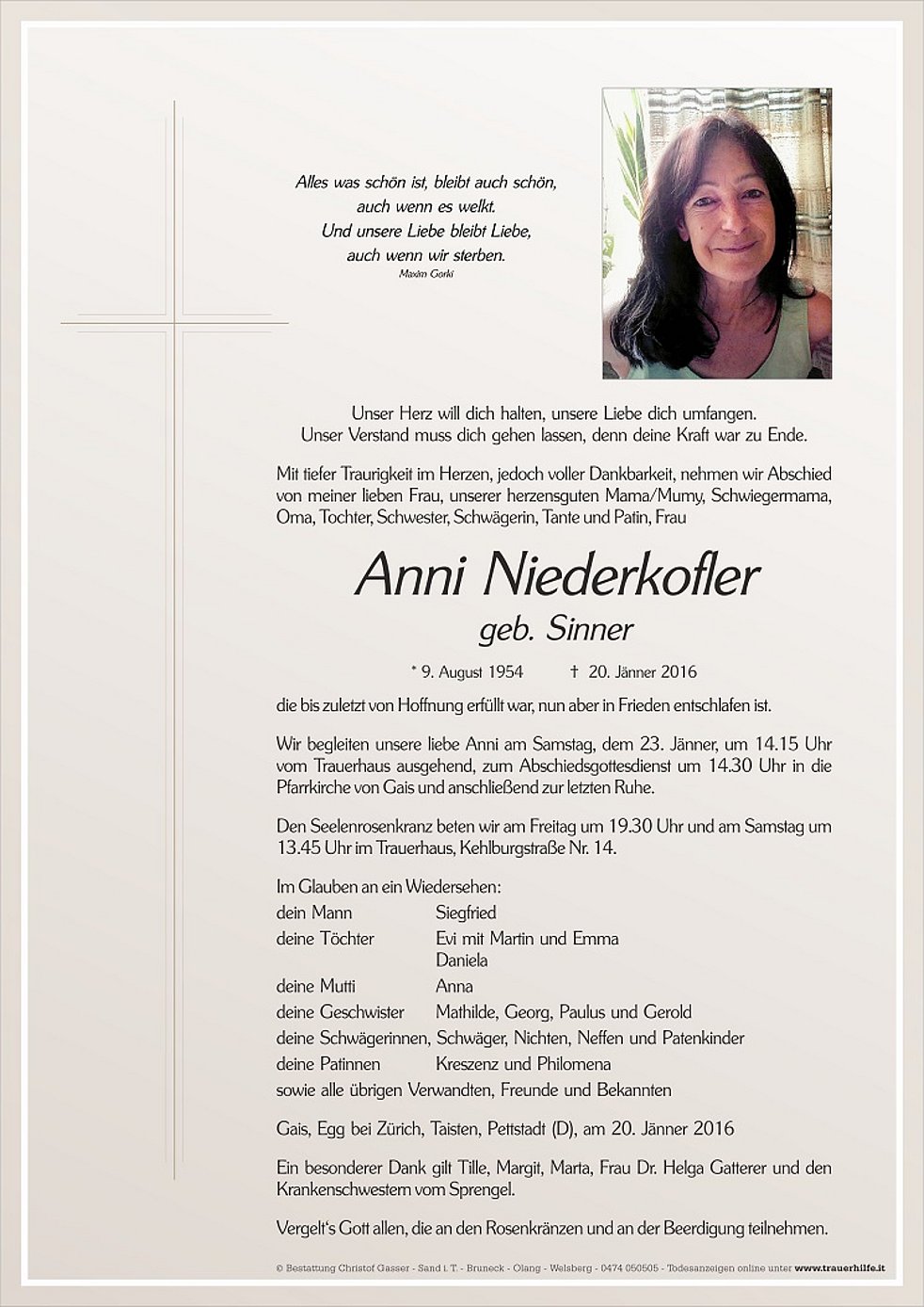 Wir begleiten unsere liebe Anni am Samstag, dem 23. Jänner, um 14.15 Uhr vom Trauerhaus ausgehend, zum Abschiedsgottesdienst um 14.30 Uhr in die Pfarrkirche von Gais und anschließend zur letzten Ruhe.