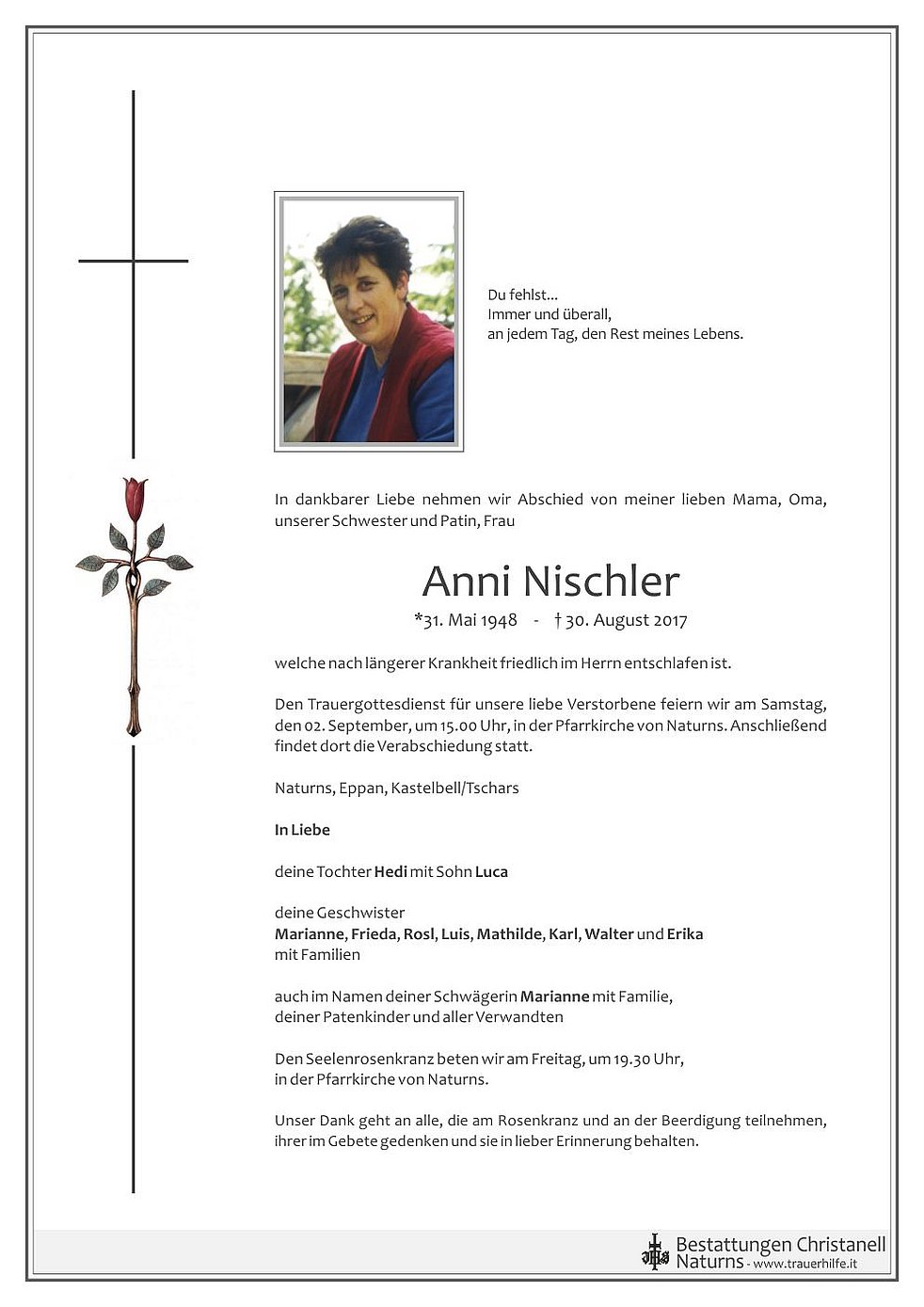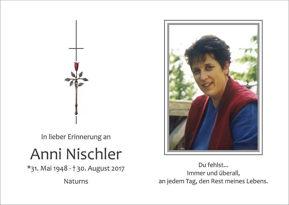 Den Trauergottesdienst für unsere liebe Verstorbene feiern wir am Samstag, den 02. September, um 15.00 Uhr, in der Pfarrkirche von Naturns. Anschließend findet dort die Verabschiedung statt.