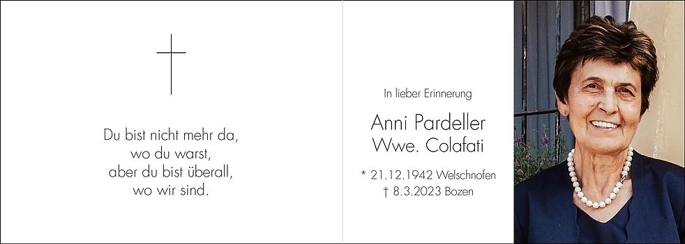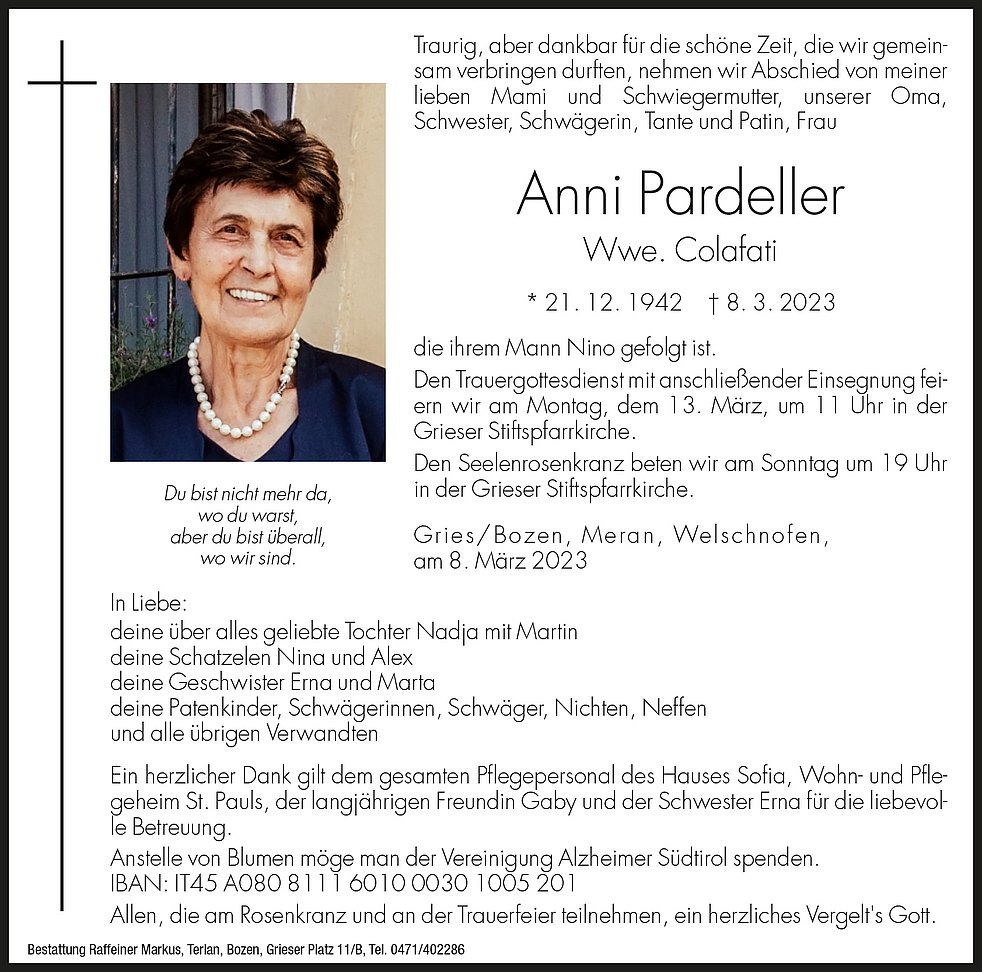Anstatt Blumen, möge man der Vereinigung Alzheimer Südtirol spenden.