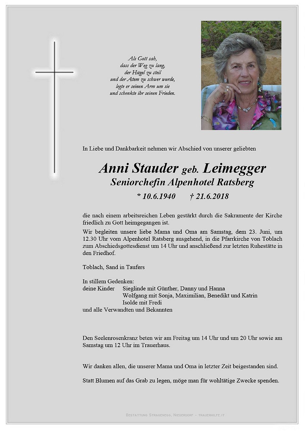 Wir begleiten unsere liebe Mama und Oma am Samstag, dem 23. Juni, um 12.30 Uhr vom Alpenhotel Ratsberg ausgehend, in die Pfarrkirche von Toblach zum Abschiedsgottesdienst um 14 Uhr und anschließend zur letzten Ruhestätte in den Friedhof.