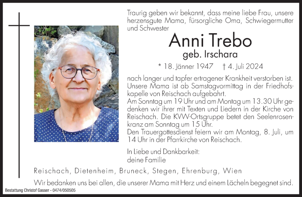 Den Trauergottesdienst feiern wir am Montag, 8. Juli, um 14 Uhr in der Pfarrkirche von Reischach.