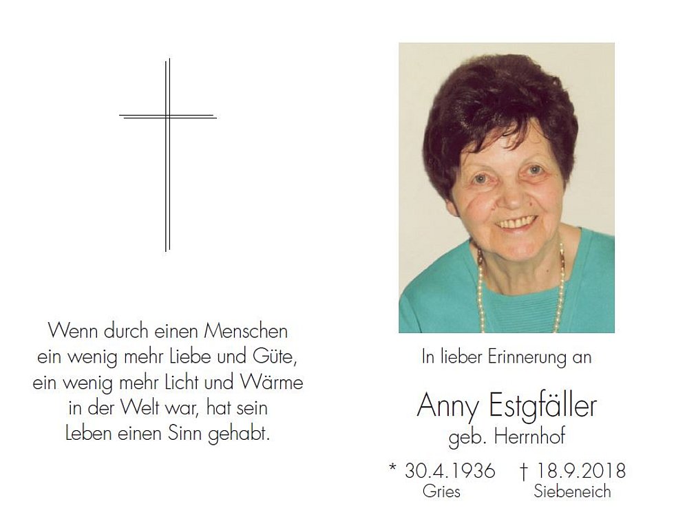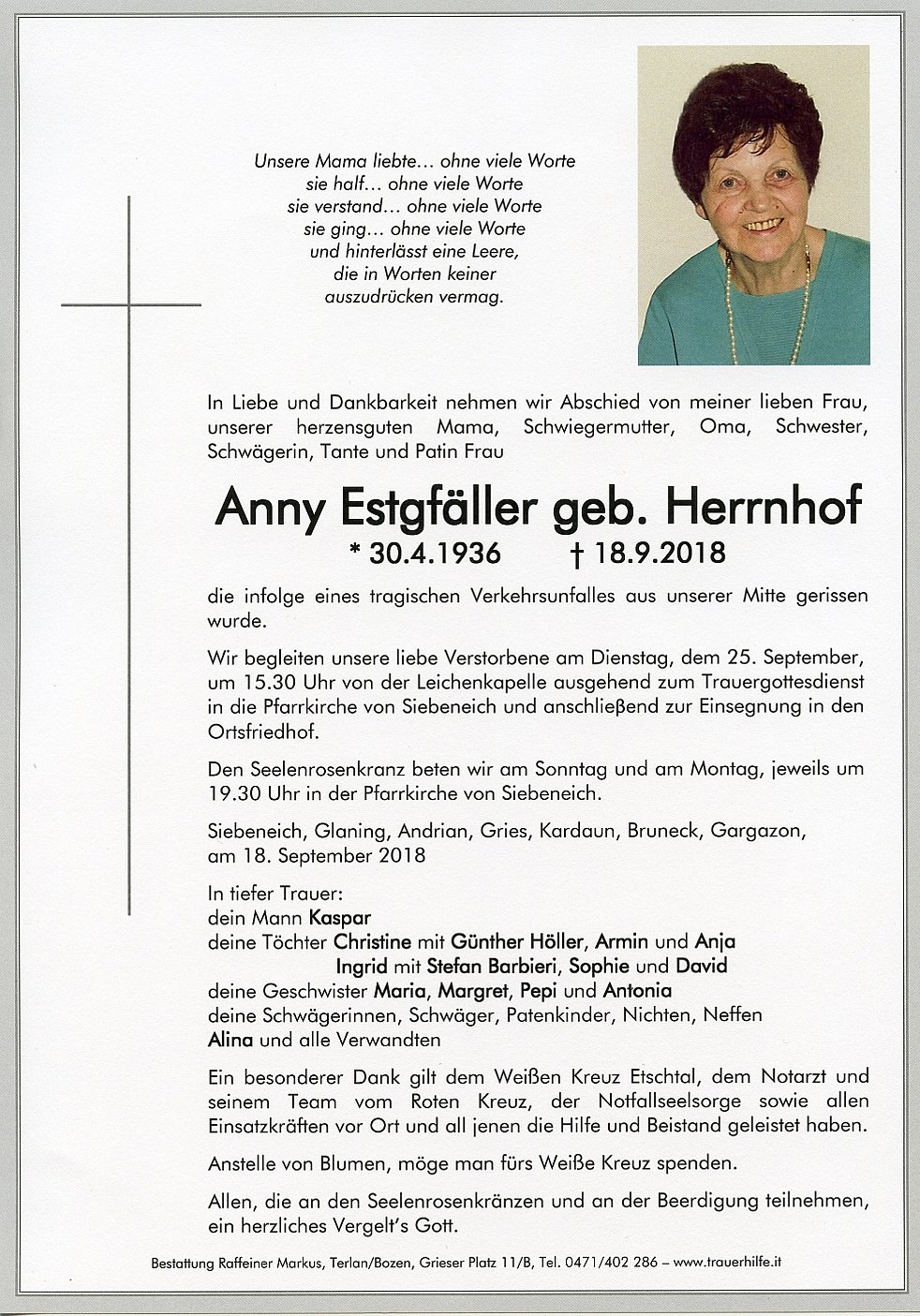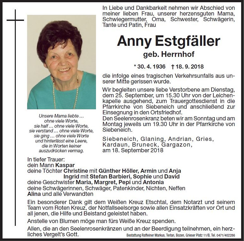 Wir begleiten unsere liebe Verstorbene am Dienstag, dem 25. September, um 15.30 Uhr von der Leichenkapelle ausgehend zum Trauergottesdienst in die Pfarrkirche von Siebeneich und anschlieβend zur Einsegnung in den Ortsfriedhof.