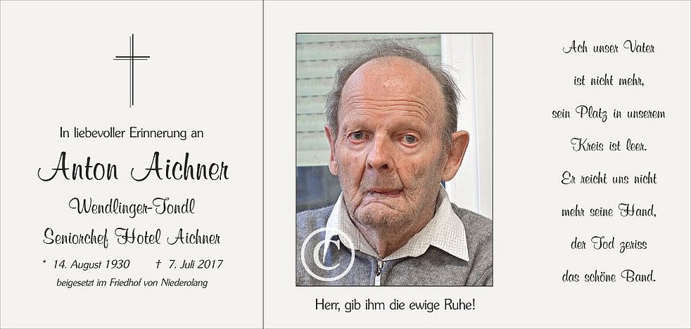 Gemeinsam begleiten wir unseren lieben Opa am Montag, dem 10. Juli, um 13.30 Uhr vom Heimathaus in Mitterolang ausgehend, zum Abschiedsgottesdienst um 14 Uhr in die Pfarrkirche von Niederolang und anschließend zur letzten Ruhe.