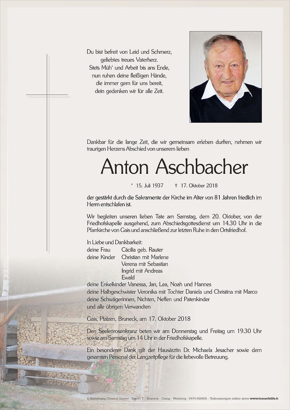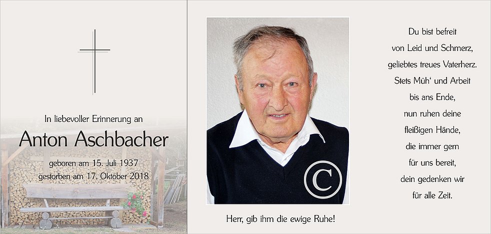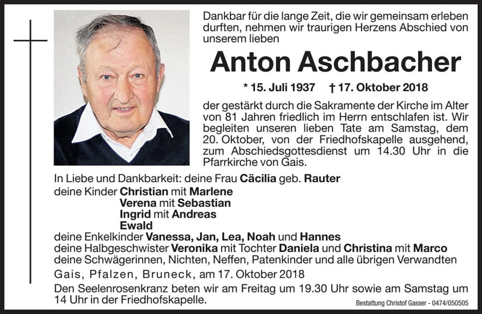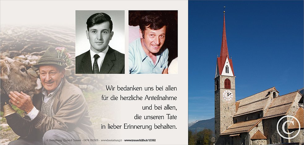 Wir begleiten unseren lieben Tate am Samstag, dem 20. Oktober, von der Friedhofskapelle ausgehend, zum Abschiedsgottesdienst um 14.30 Uhr in die Pfarrkirche von Gais und anschließend zur letzten Ruhe in den Ortsfriedhof.