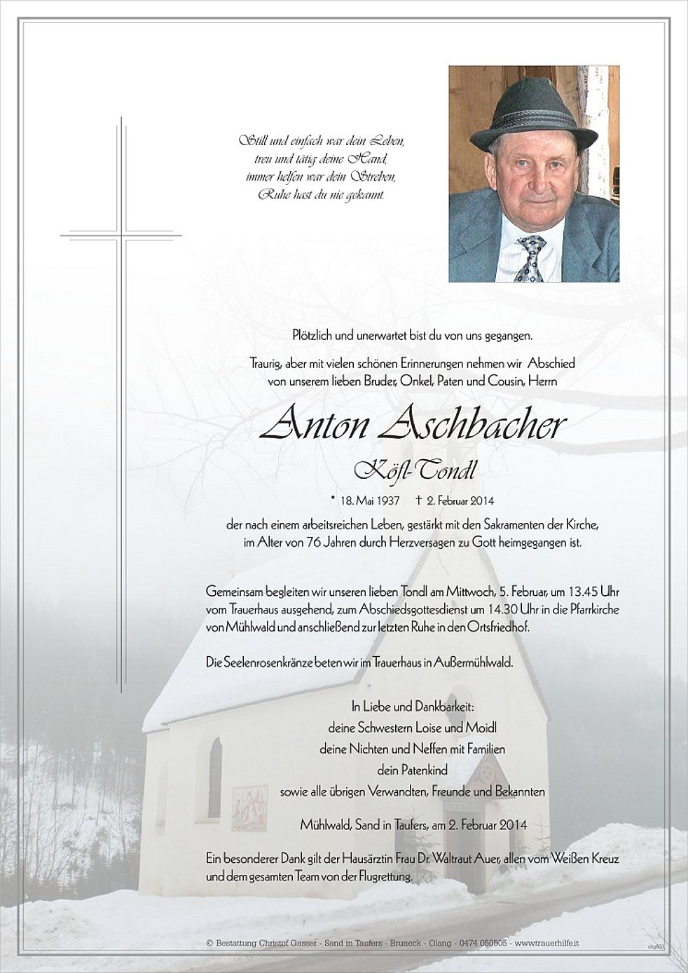 Gemeinsam begleiten wir unseren lieben Tondl am Mittwoch, 5. Februar, um 13.45 Uhr vom Trauerhaus ausgehend, zum Abschiedsgottesdienst um 14.30 Uhr in die Pfarrkirche von Mühlwald und anschließend zur letzten Ruhe in den Ortsfriedhof.