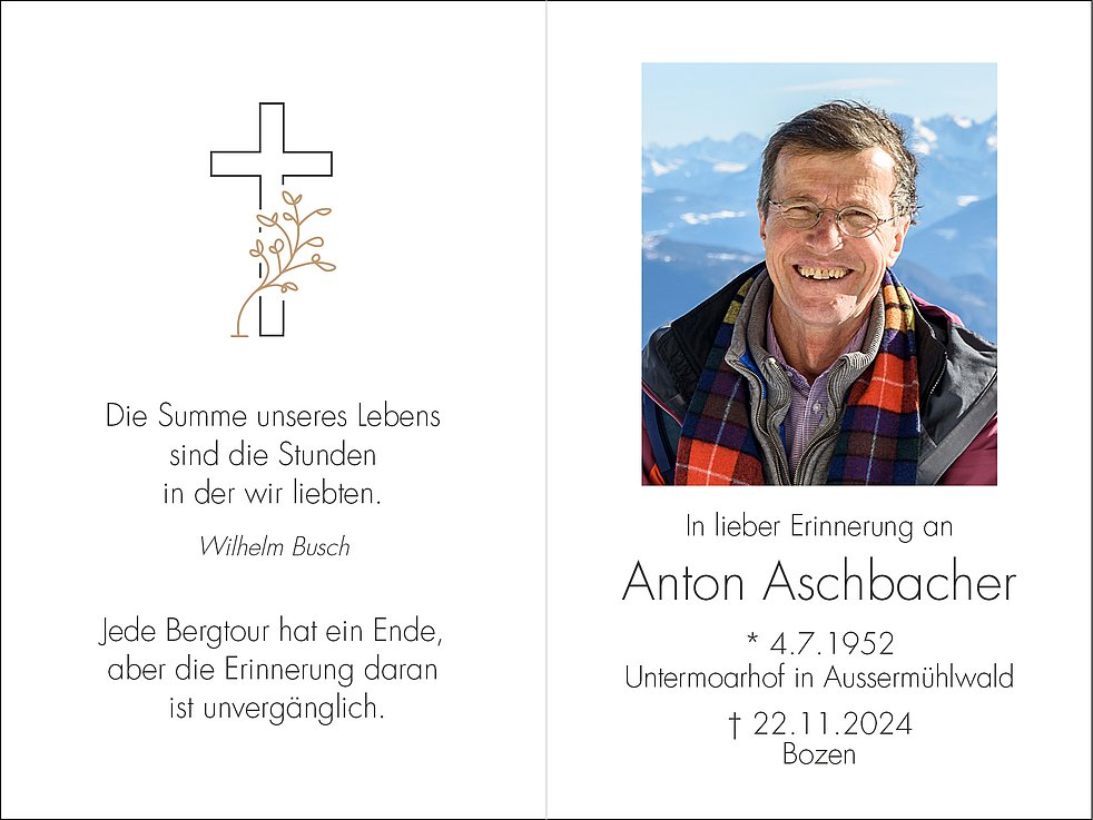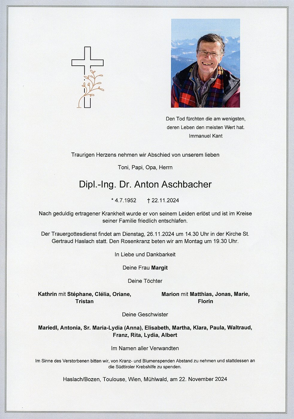 Im Sinne des Verstorbenen bitten wir, von Kranz- und Blumenspenden Abstand zu nehmen und stattdessen an die Südtiroler Krebshilfe zu spenden.