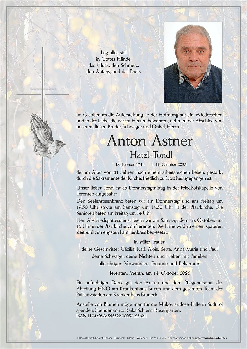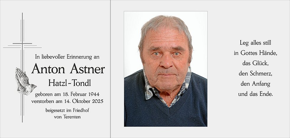 Den Abschiedsgottesdienst feiern wir am Samstag, dem 18. Oktober, um 15 Uhr in der Pfarrkirche von Terenten. Die Urne wird zu einem späteren Zeitpunkt im engsten Familienkreis beigesetzt.