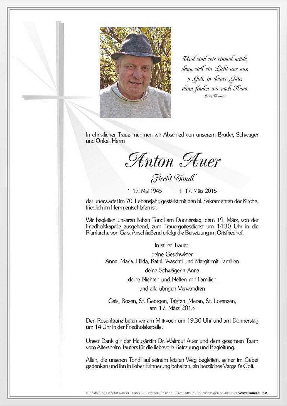 Wir begleiten unseren lieben Tondl am Donnerstag, dem 19. März, von der Friedhofskapelle ausgehend, zum Trauergottesdienst um 14.30 Uhr in die Pfarrkirche von Gais. Anschließend erfolgt die Beisetzung im Ortsfriedhof.