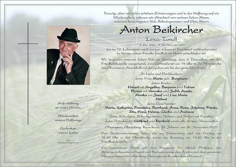 Wir begleiten unseren lieben Vati am Samstag, dem 3. Dezember, von der Friedhofskapelle ausgehend, zum Gottesdienst um 14 Uhr in die Pfarrkirche von Oberrasen. Anschließend übergeben wir ihn der geweihten Erde.