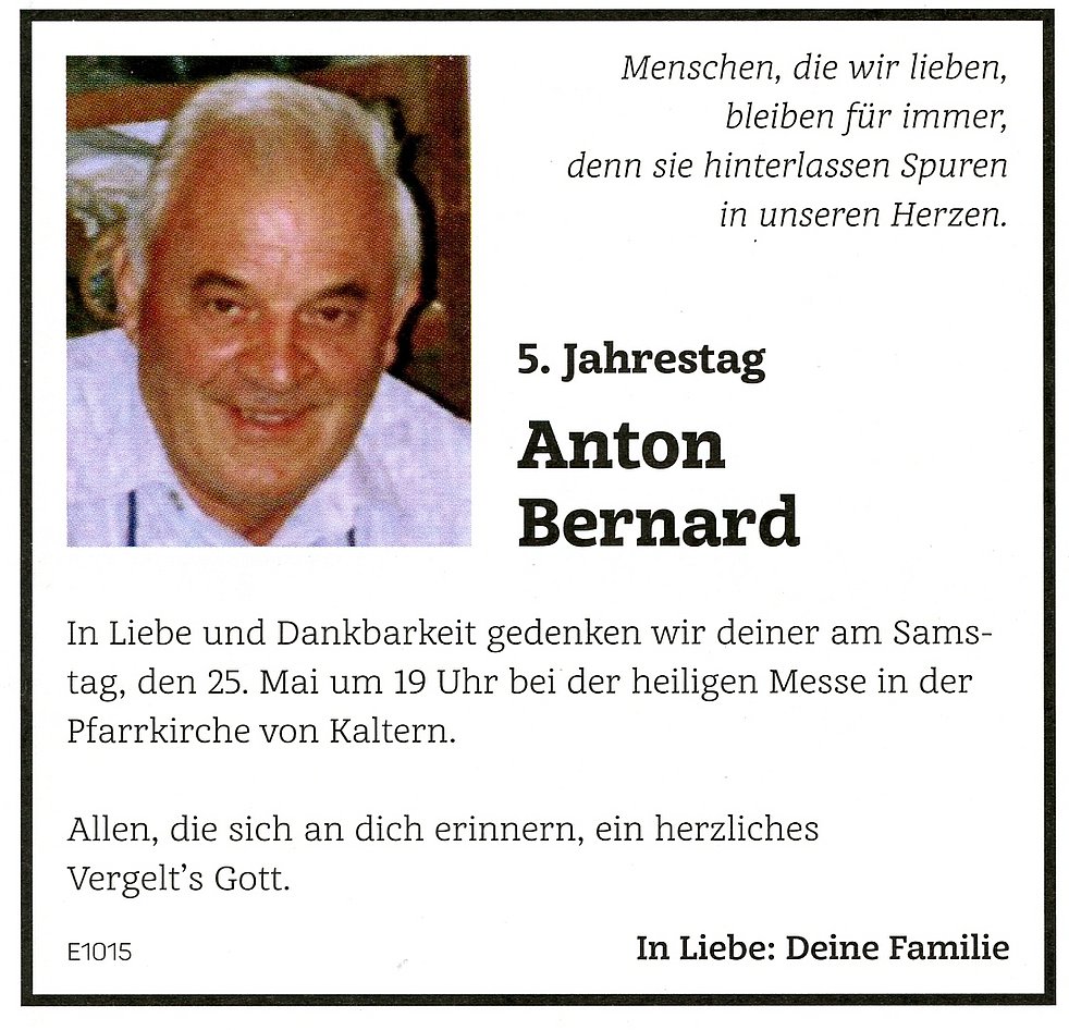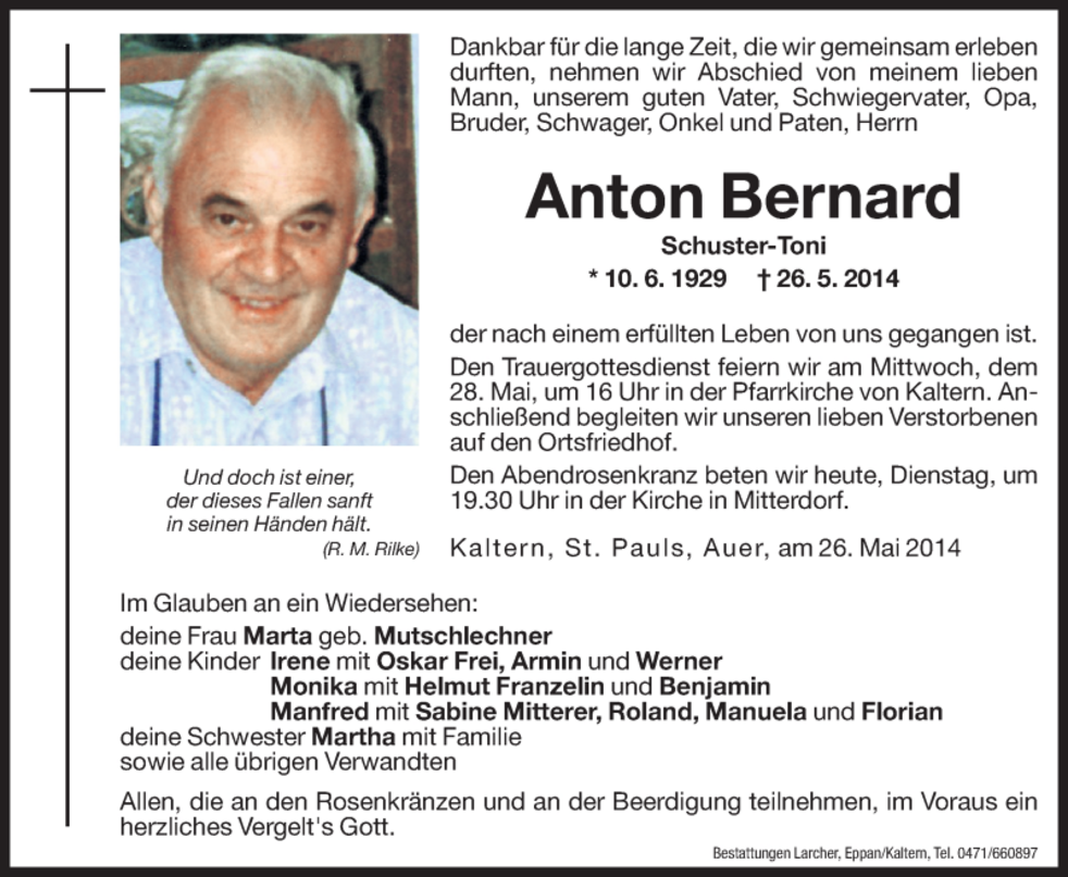 Den Trauergottesdienst feiern wir am Mittwoch, den 28. Mai um 16 Uhr in der Pfarrkirche von Kaltern. Anschließend begleiten wir unseren lieben Verstorbenen zum Ortsfriedhof.