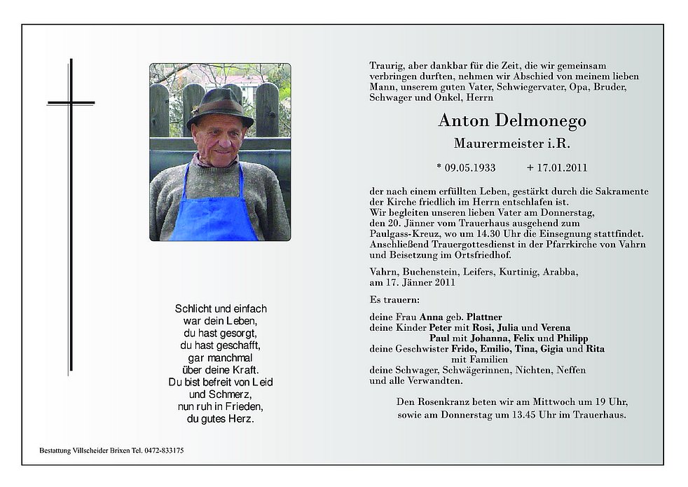 Anschließend Trauergottesdienst in der Pfarrkirche von Vahrn und Beisetzung im Ortsfriedhof.
