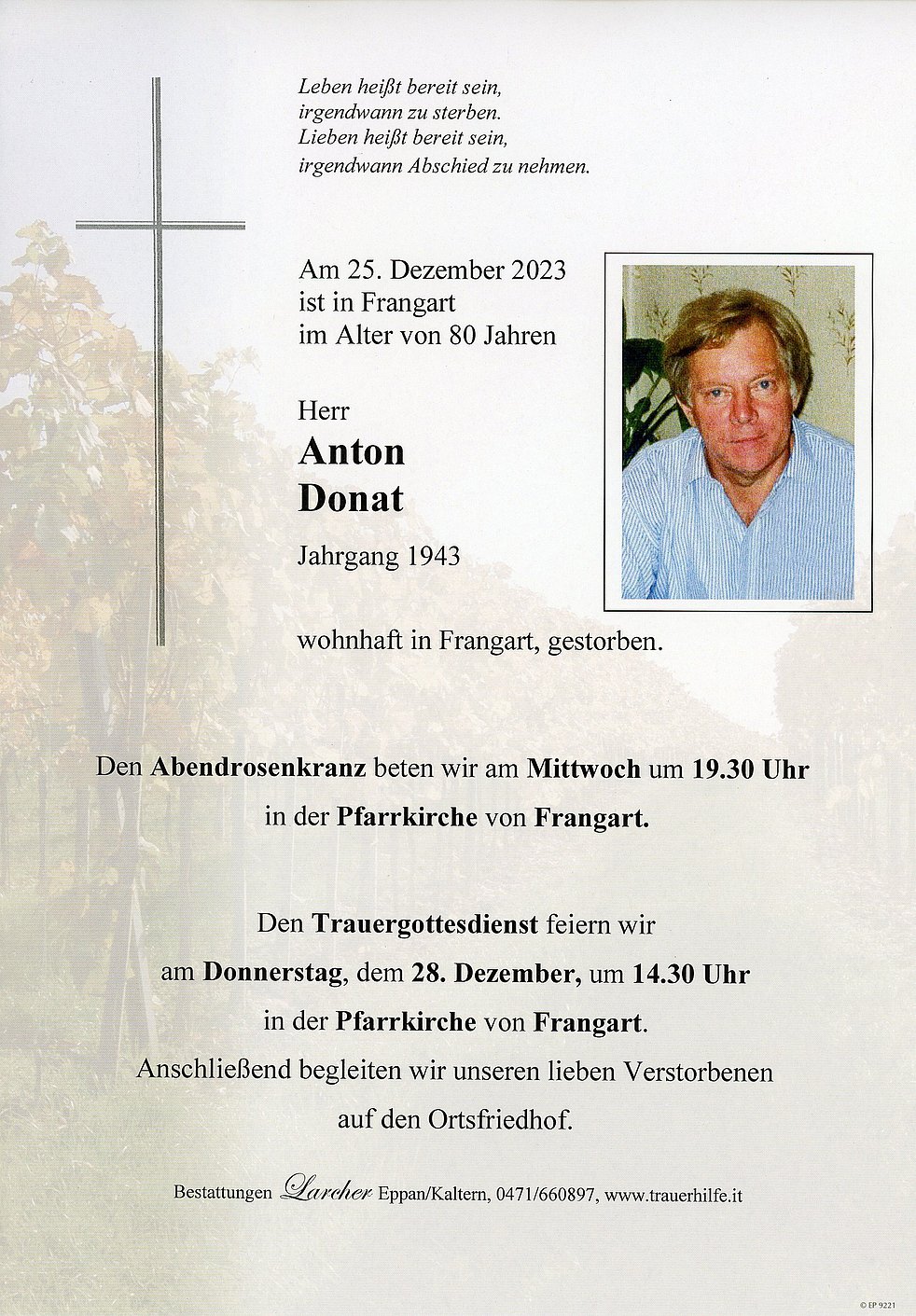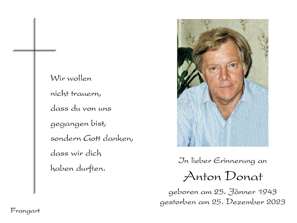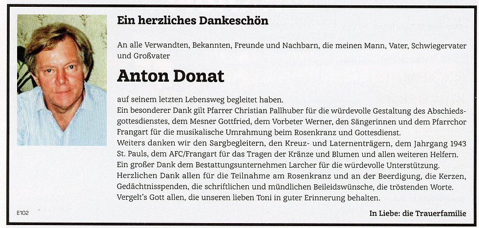 Den Trauergottesdienst feiern wir am Donnerstag, dem 28. Dezember um 14.30 Uhr in der Pfarrkirche von Frangart. Anschließend begleiten wir unseren lieben Verstorbenen auf den Ortsfriedhof.