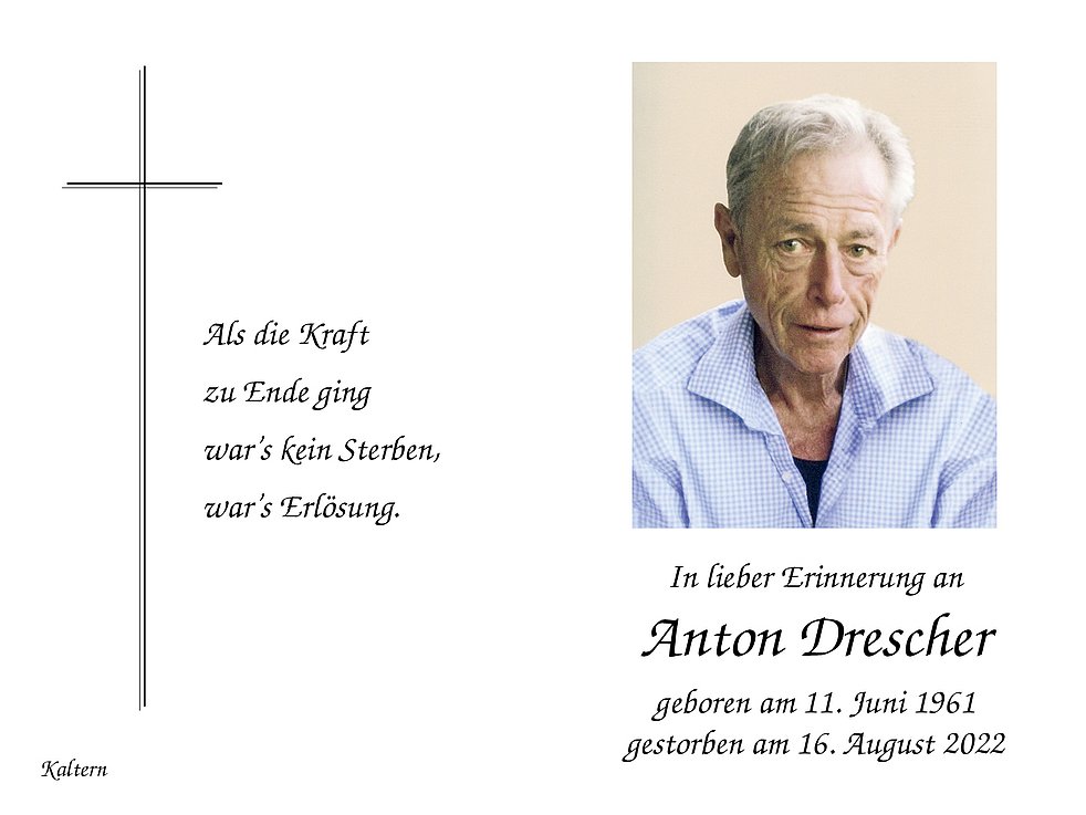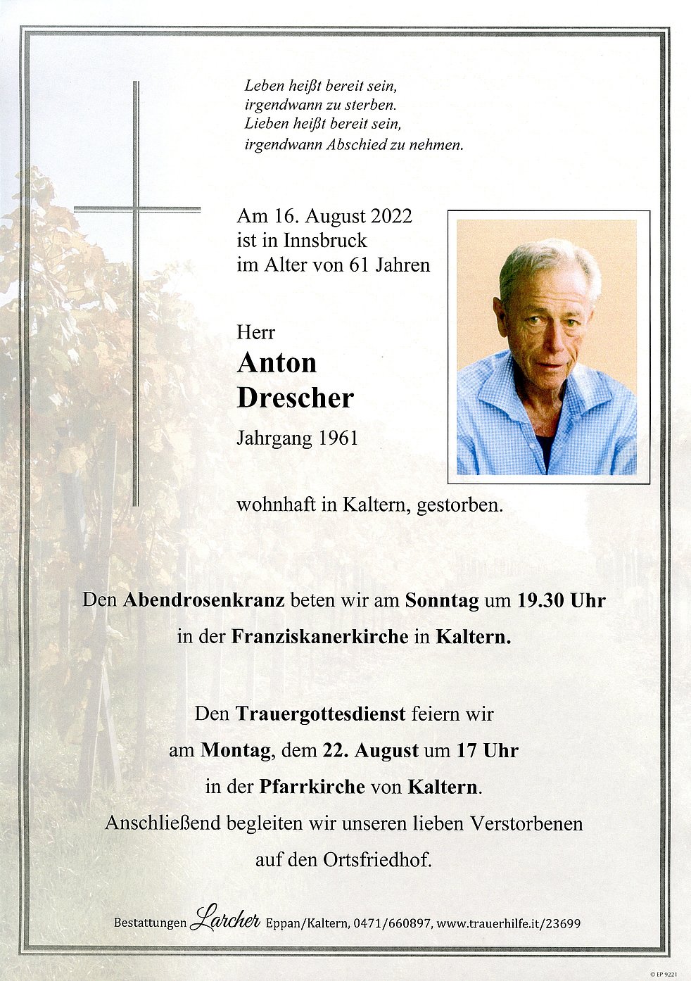 Den Trauergottesdienst feiern wir am Montag, 22. August um 17 Uhr in der Pfarrkirche von Kaltern. Anschließend begleiten wir unseren lieben Verstorbenen auf den Ortsfriedhof.