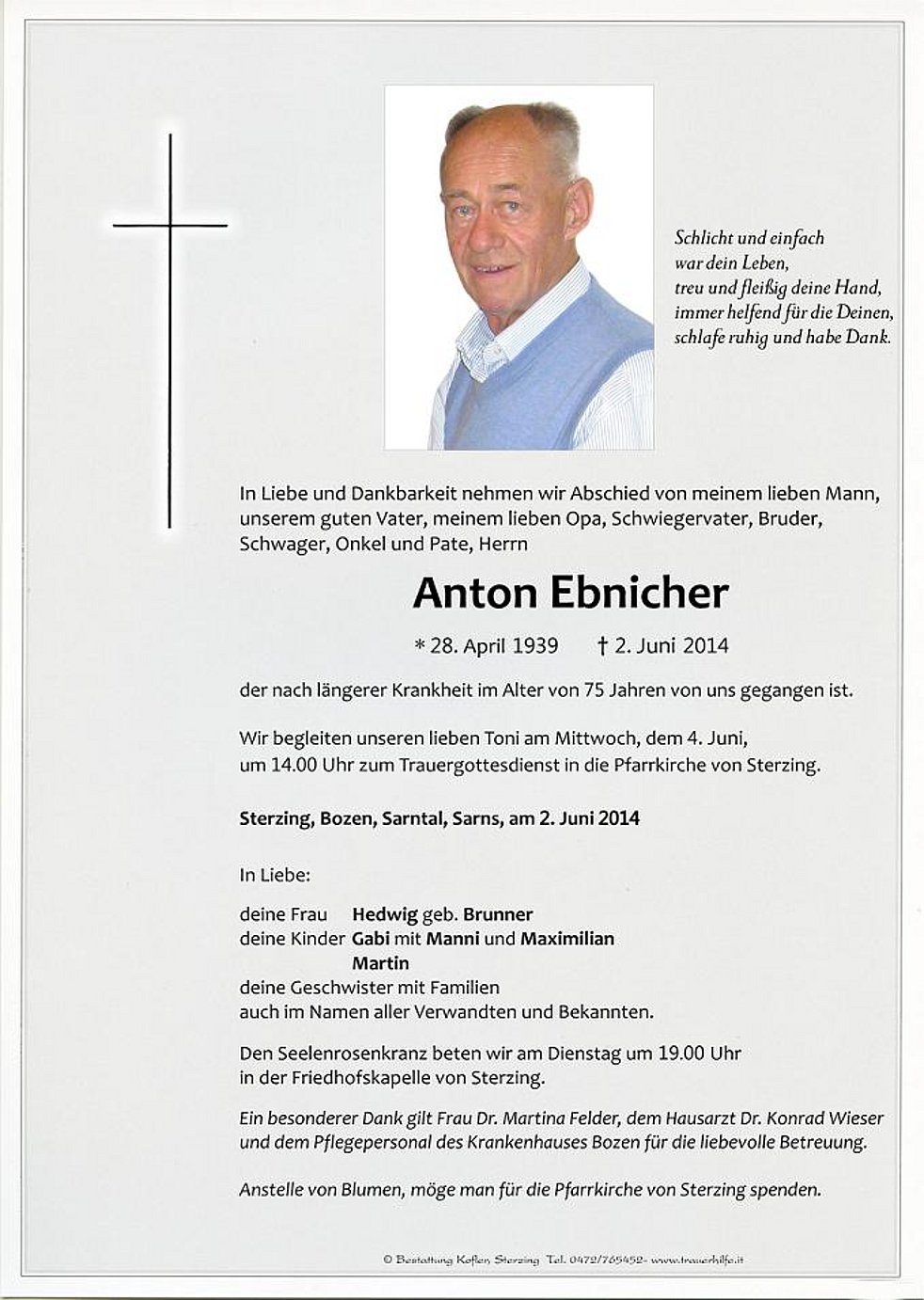 Anstelle von Blumen, möge man für die Pfarrkirche von Sterzing spenden.