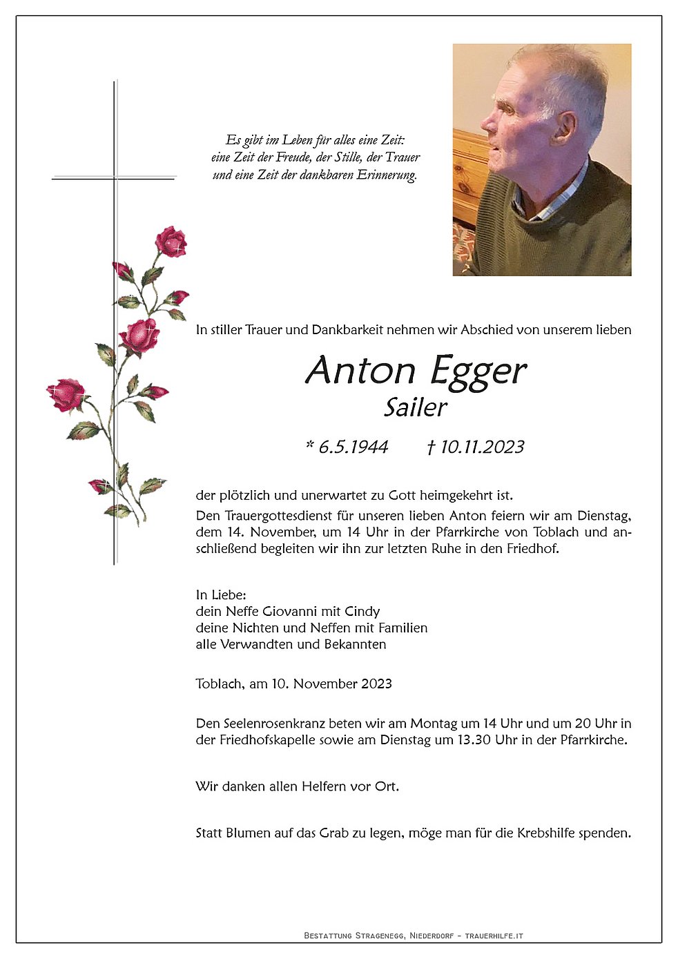 Begräbnisgottesdienst: 14.11. - 14:00 Uhr Toblach