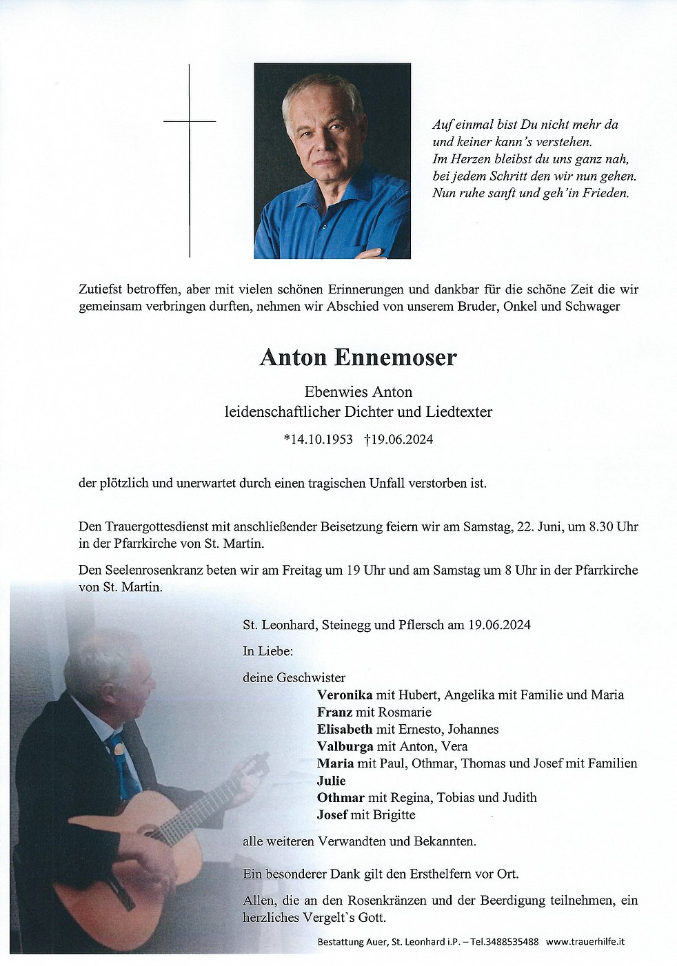 Zutiefst betroffen, aber mit vielen schönen Erinnerungen und dankbar für die schöne Zeit die wir gemeinsam verbringen durften, nehmen wir Abschied von unserem Bruder, Onkel und Schwager