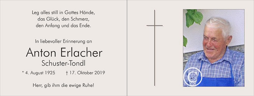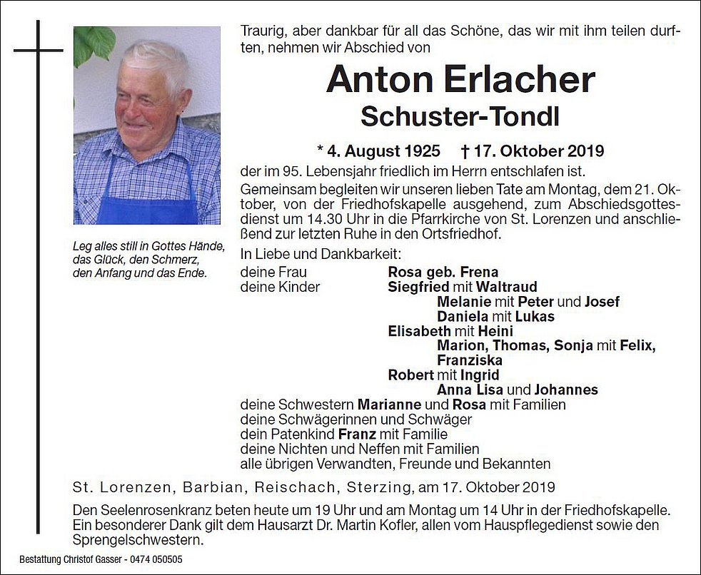 Gemeinsam begleiten wir unseren lieben Tate am Montag, dem 21. Oktober, von der Friedhofskapelle ausgehend, zum Abschiedsgottesdienst um 14.30 Uhr in die Pfarrkirche von St. Lorenzen und anschließend zur letzten Ruhe in den Ortsfriedhof.