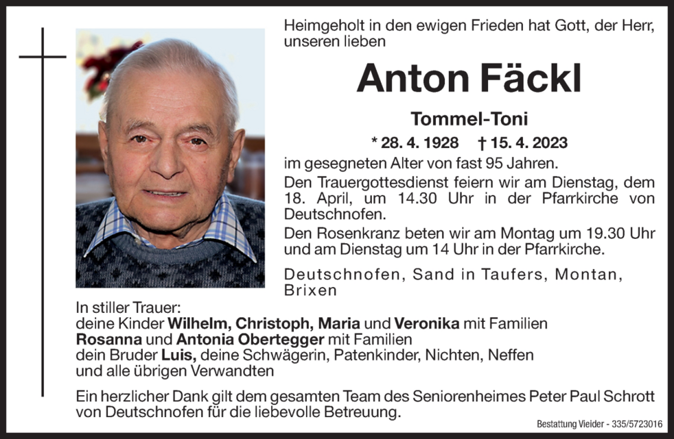 Den Trauergottesdienst feiern wir am Dienstag, dem 18. April, um 14.30 Uhr in der Pfarrkirche von Deutschnofen.