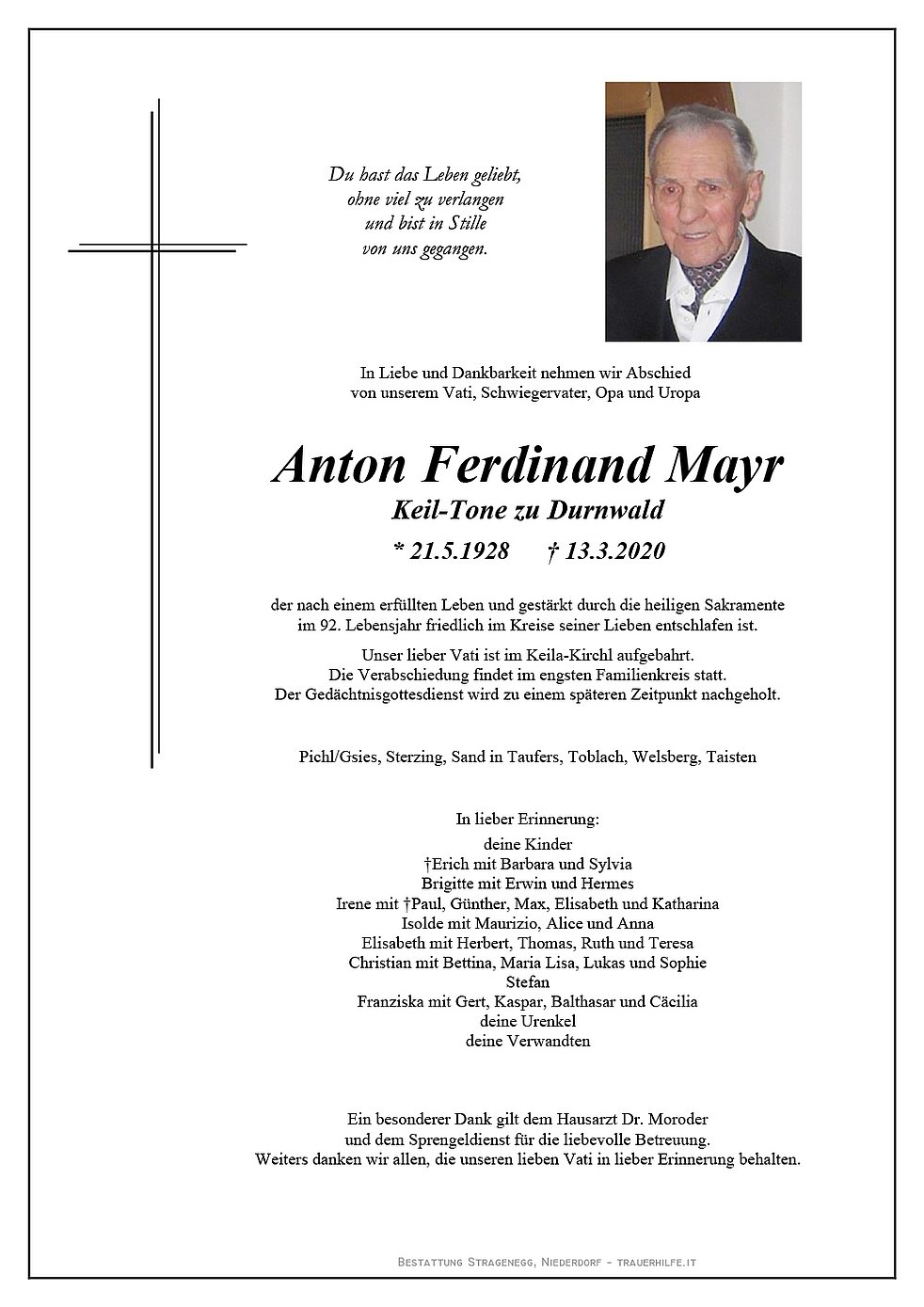 Ein besonderer Dank gilt dem Hausarzt Dr. Moroder und dem Sprengeldienst für die liebevolle Betreuung. Weiters danken wir allen, die unseren lieben Vati in lieber Erinnerung behalten.