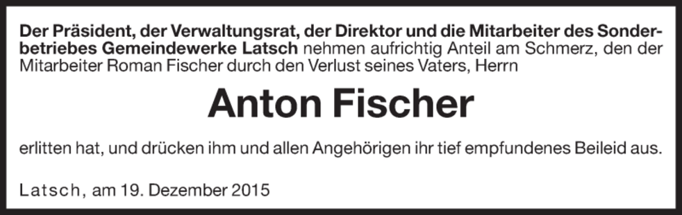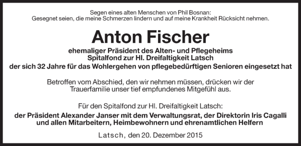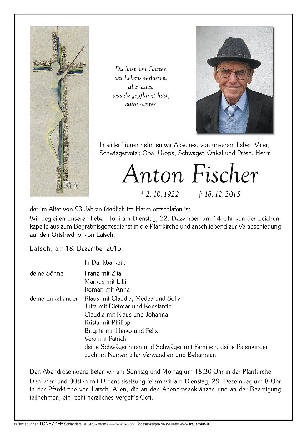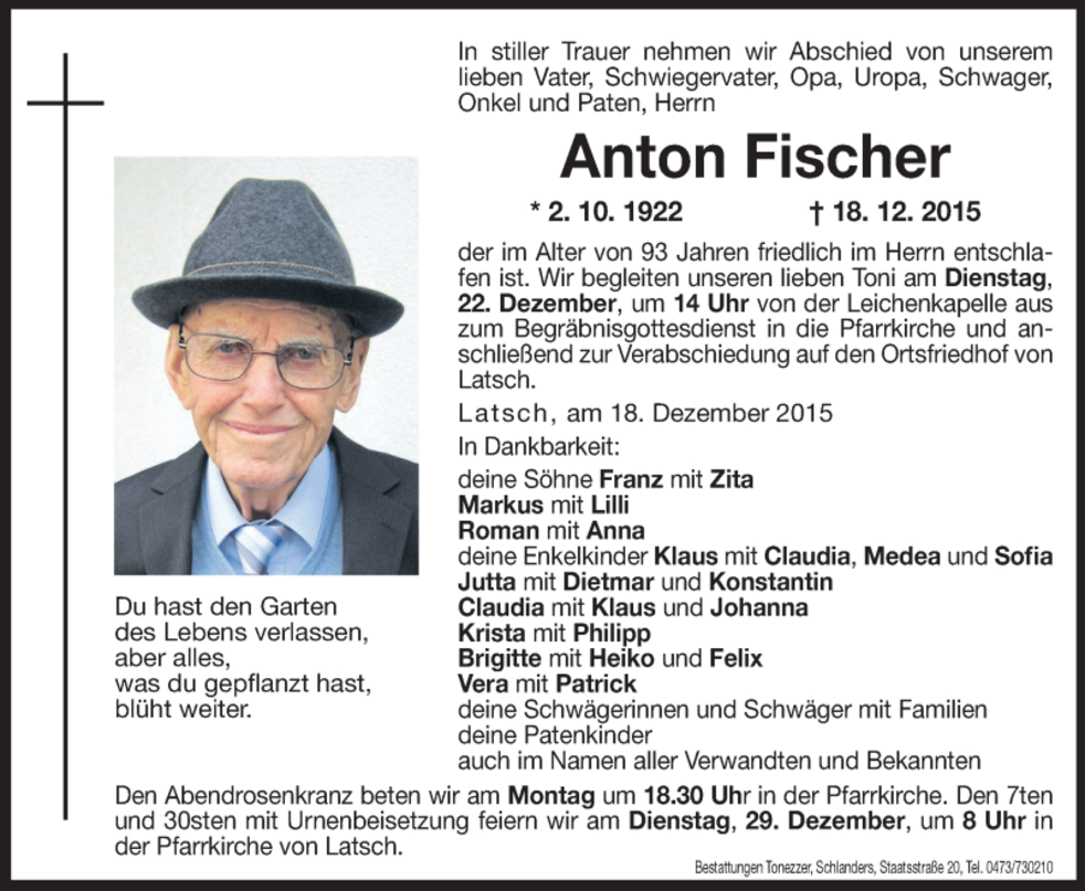Wir begleiten unseren lieben Toni am Dienstag, 22. Dezember, um 14 Uhr von der Leichenkapelle aus zum Begräbnisgottesdienst in die Pfarrkirche und anschließend zur Verabschiedung auf den Ortsfriedhof von Latsch.
