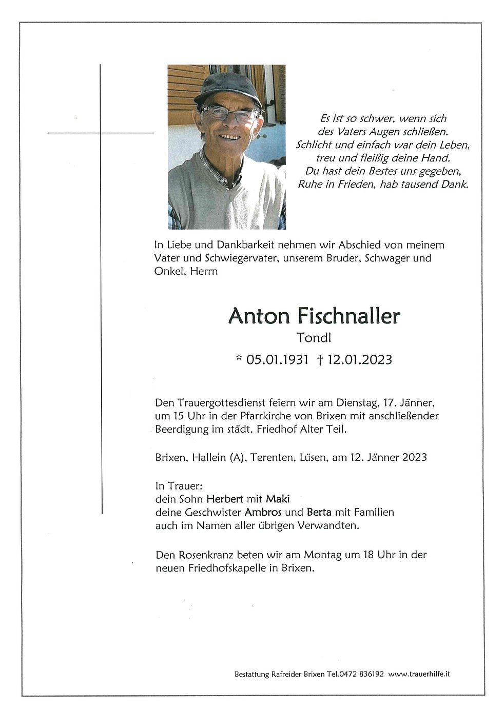 Den Trauergottesdienst feiern wir am Dienstag, 17. Jänner, um 15 Uhr in der Pfarrkirche von Brixen mit anschließender Beerdigung im städt. Friedhof Alter Teil.