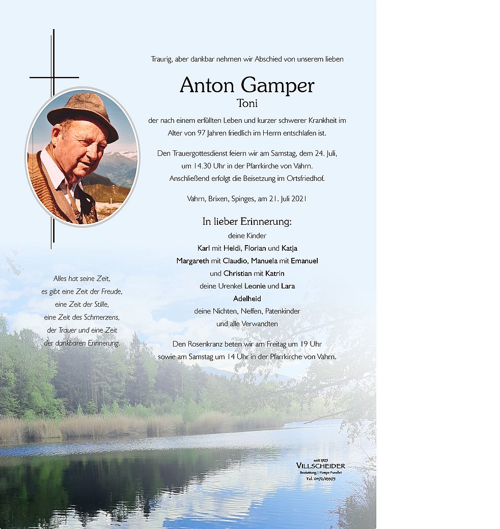 Mein aufrichtiges Beileid! Behalte Anton Gamper als positiven und tapferen Menschen in lieber Erinnerung!
