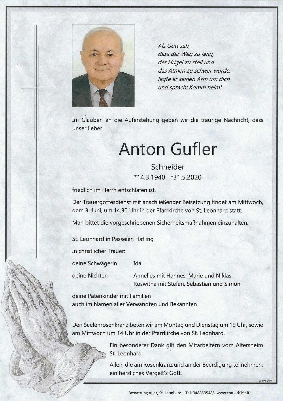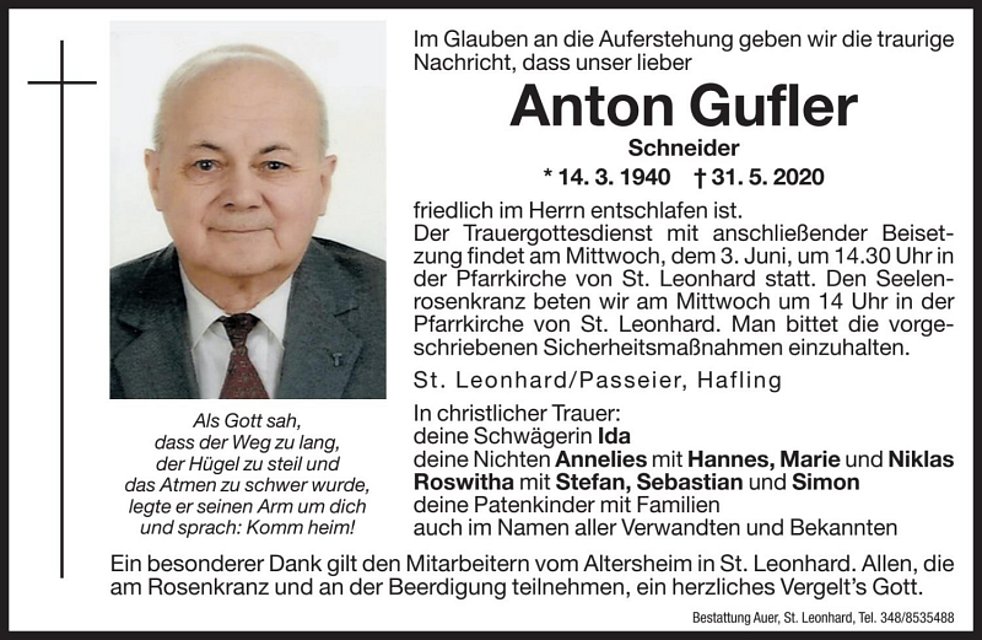 Der Trauergottesdienst mit anschließender Beisetzung findet am Mittwoch, dem 3. Juni, um 14.30 Uhr in der Pfarrkirche von St. Leonhard statt.
