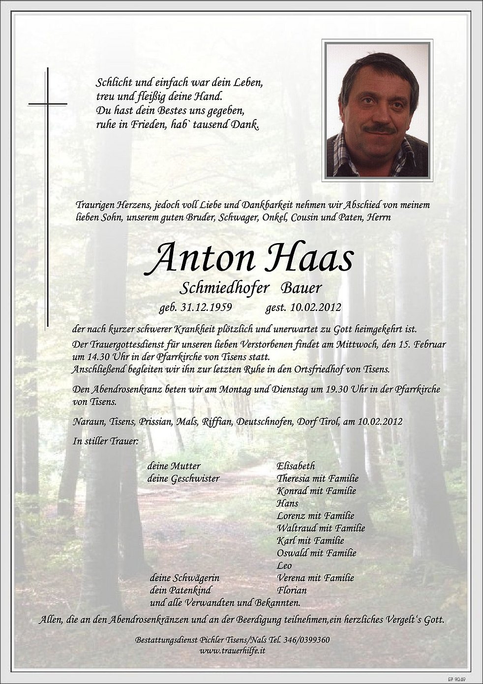 Der Trauergottesdienst für unseren lieben Verstorbenen findet am Mittwoch, den 15. Februar