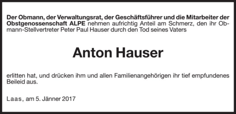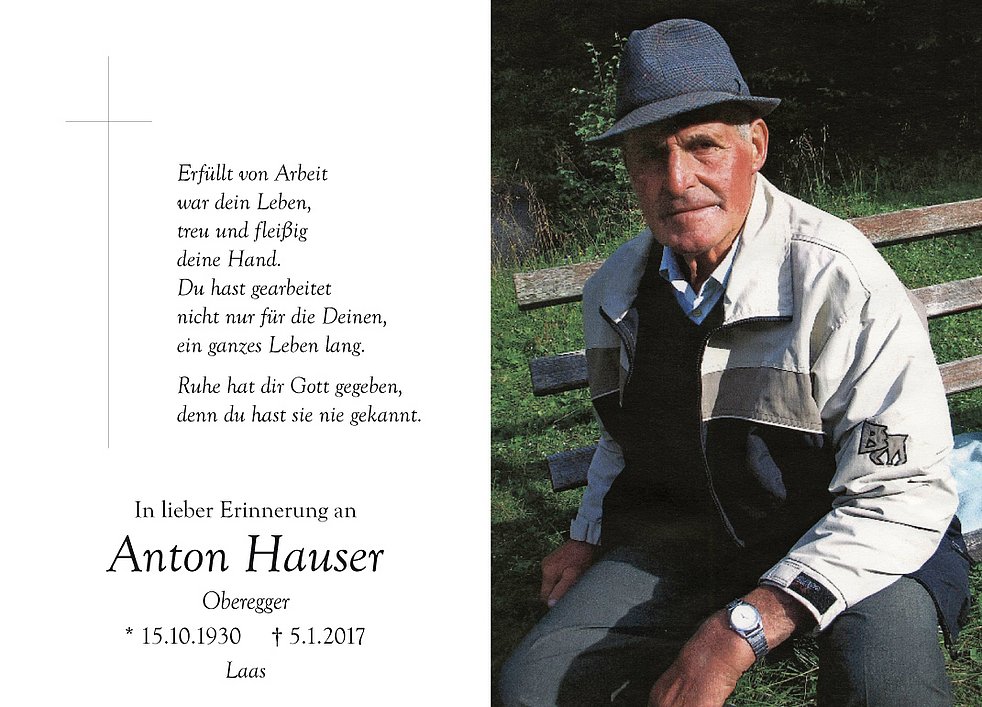der im Alter von 86 Jahren von Gott in seinen ewigen Frieden heimgeholt wurde. Wir begleiten unseren lieben Vater am Samstag, 7. Jänner, um 14 Uhr von der Leichenkapelle aus mit Umgang durch das Dorf zum Begräbnisgottesdienst in die Pfarrkirche und anschließend zur letzten Ruhe auf den Ortsfriedhof von Laas.