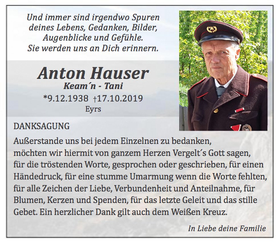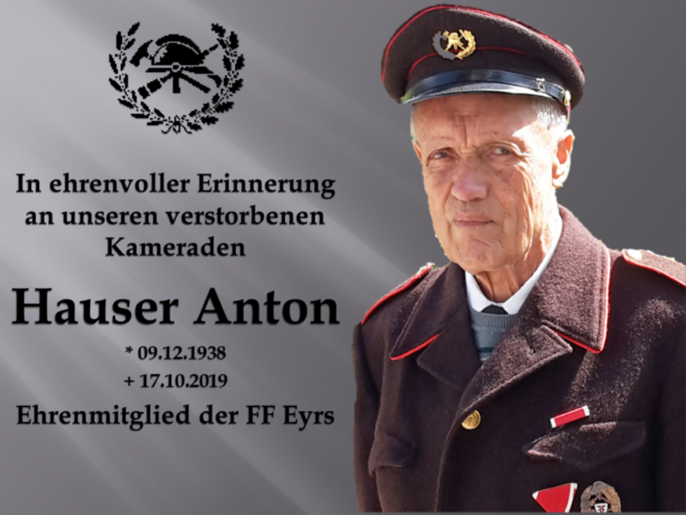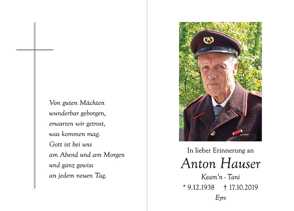 Wir begleiten unseren lieben Tata am Samstag, 19. Oktober, um 14.30 Uhr von der Leichenkapelle aus zum Begräbnisgottesdienst in die Pfarrkirche und anschließend zur Verabschiedung auf den Ortsfriedhof von Eyrs.