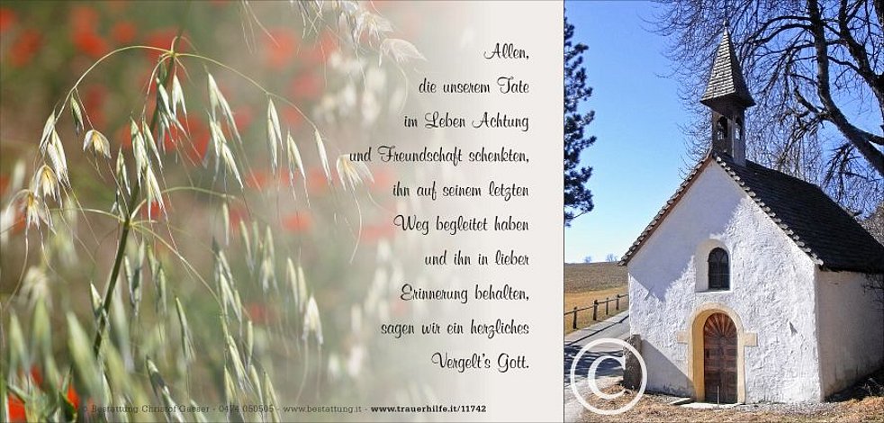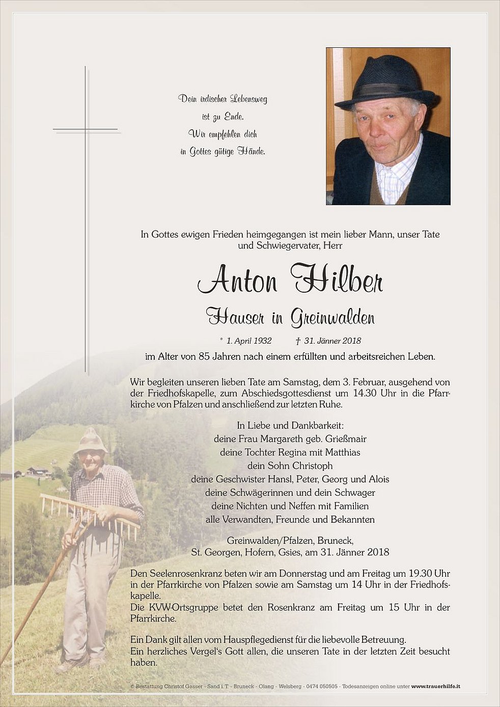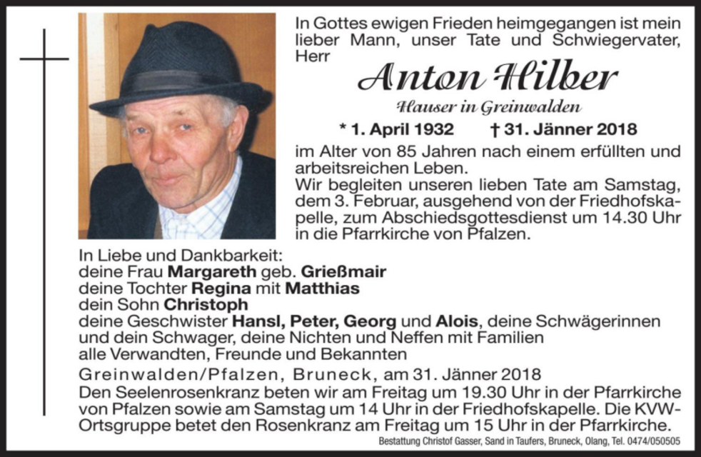 Wir begleiten unseren lieben Tate am Samstag, dem 3. Februar, ausgehend von der Friedhofskapelle, zum Abschiedsgottesdienst um 14.30 Uhr in die Pfarr-kirche von Pfalzen und anschließend zur letzten Ruhe.