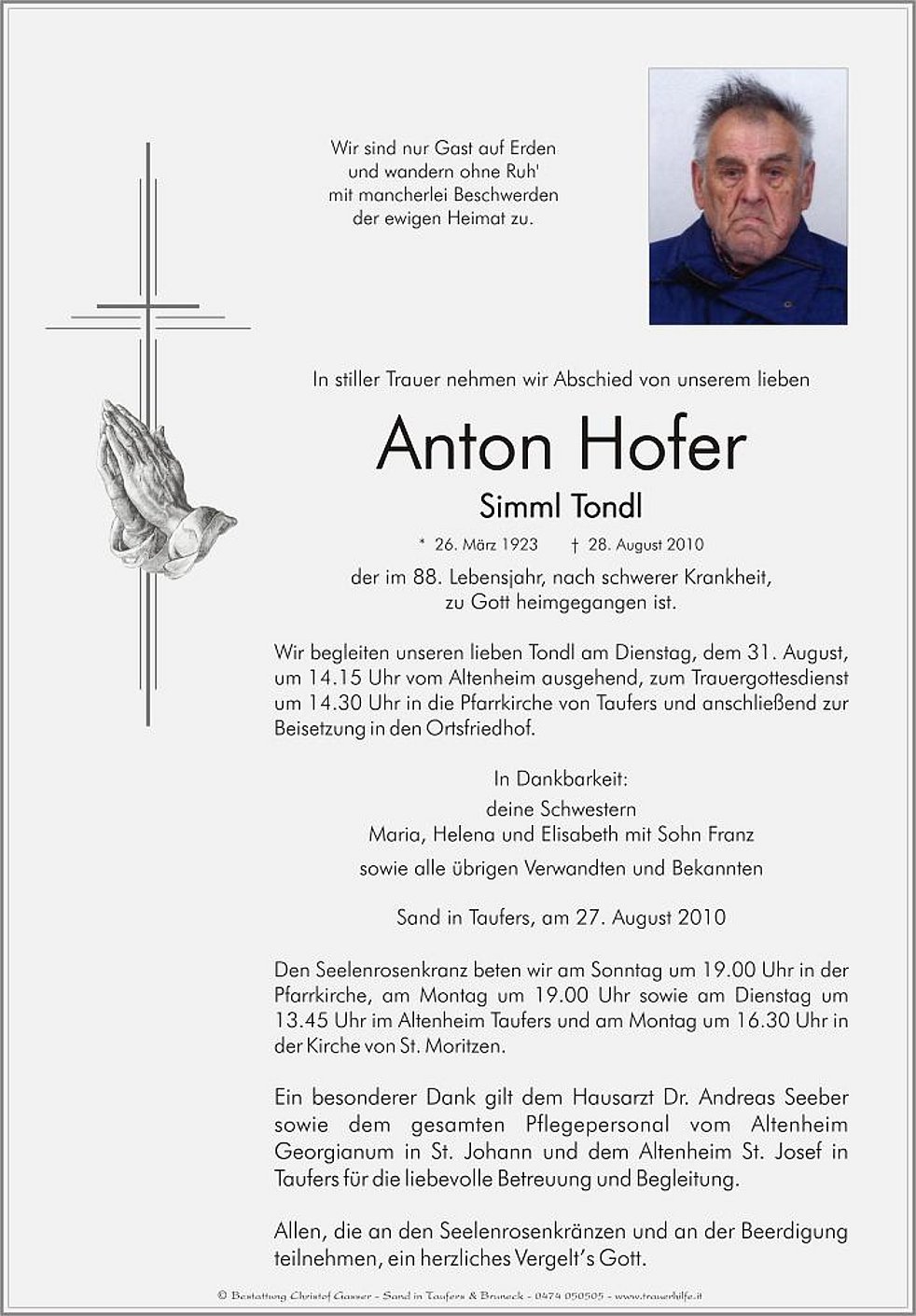 Wir begleiten unseren lieben Tondl am Dienstag, dem 31. August, um 14.15 Uhr vom Altenheim ausgehend, zum Trauergottesdienst um 14.30 Uhr in die Pfarrkirche von Taufers und anschließend zur Beisetzung in den Ortsfriedhof.