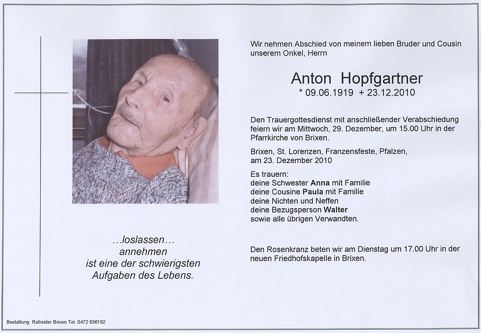 Den Trauergottesdienst mit anschließender Verabschiedung feiern wir am Mittwoch, 29. Dezember, um 15.00 Uhr in der Pfarrkirche von Brixen.