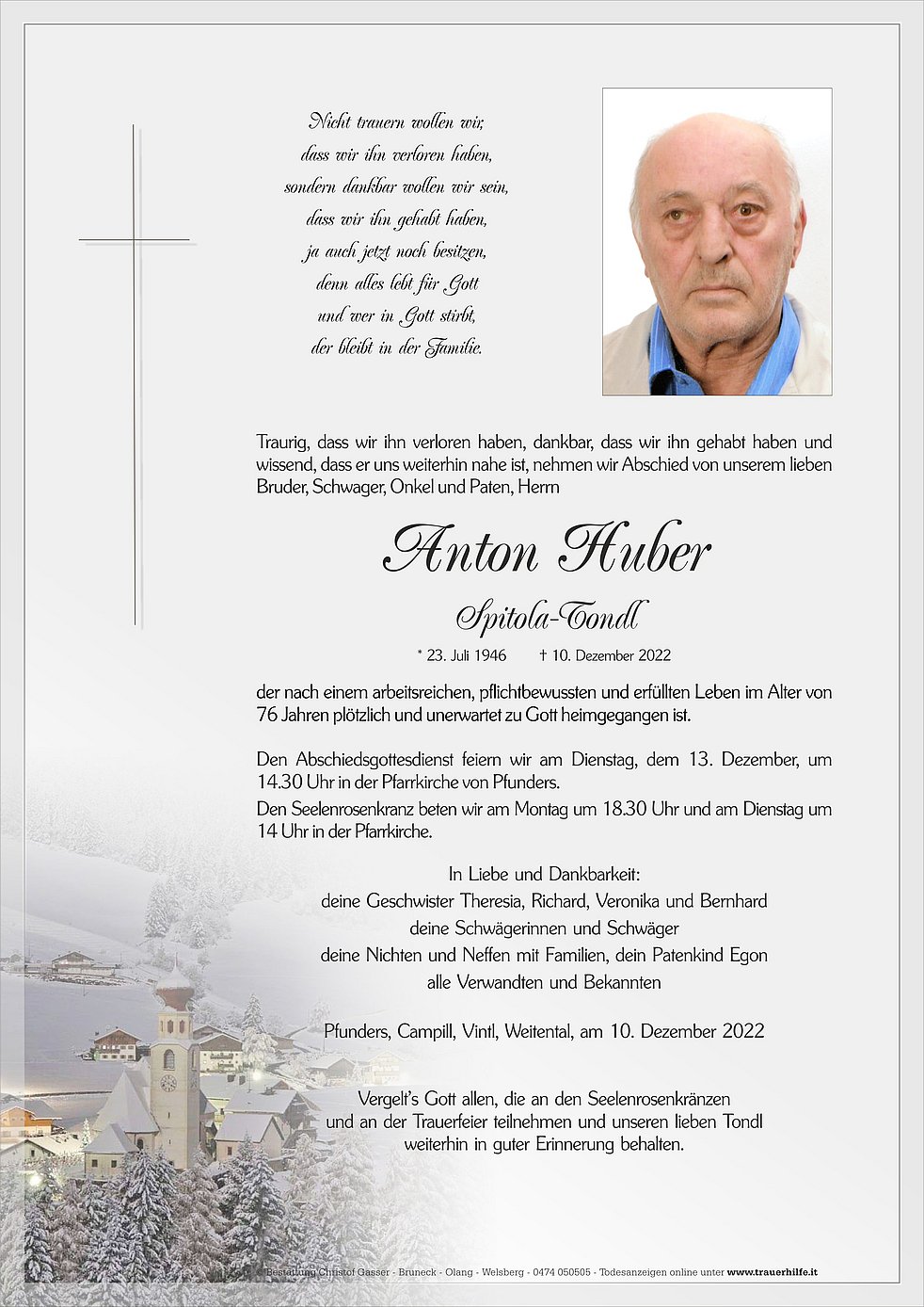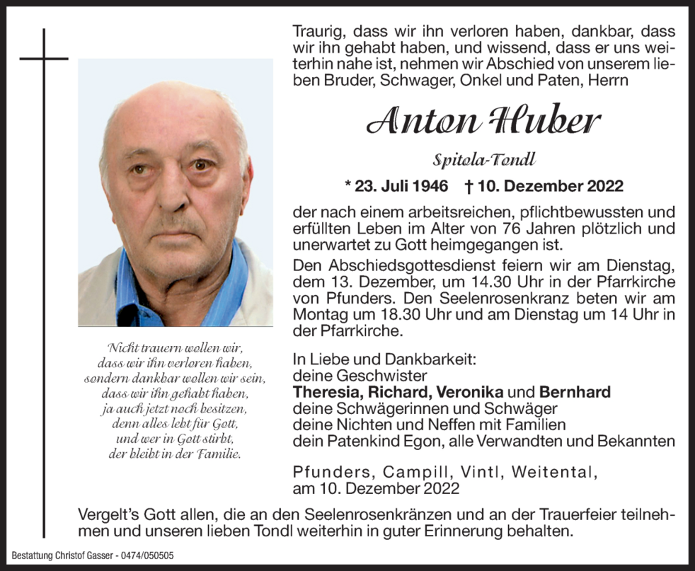 der nach einem arbeitsreichen, pflichtbewussten und erfüllten Leben im Alter von 76 Jahren plötzlich und unerwartet zu Gott heimgegangen ist.