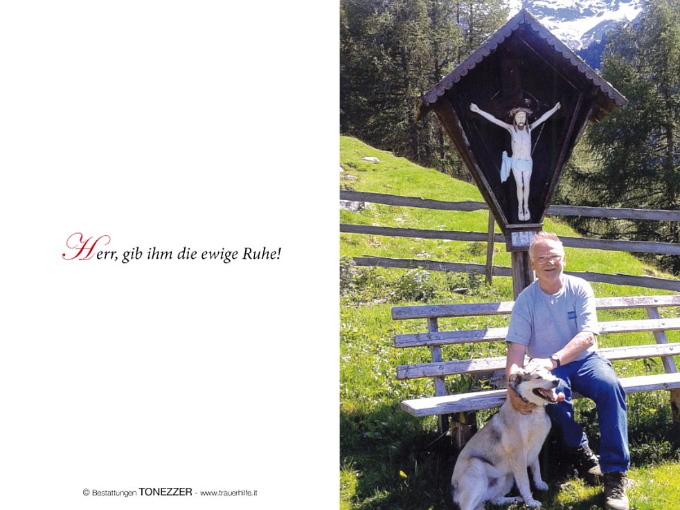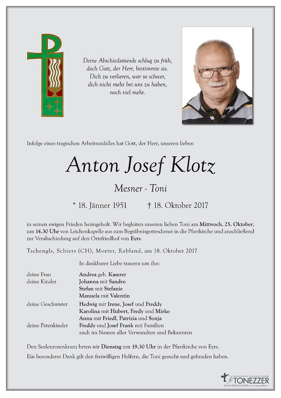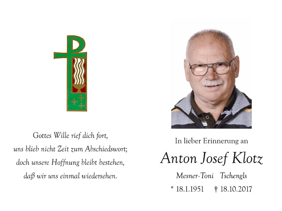 Wir begleiten unseren lieben Toni am Mittwoch, 25. Oktober, um 14.30 Uhr von Leichenkapelle aus zum Begräbnisgottesdienst in die Pfarrkirche und anschließend zur Verabschiedung auf den Ortsfriedhof von Eyrs.