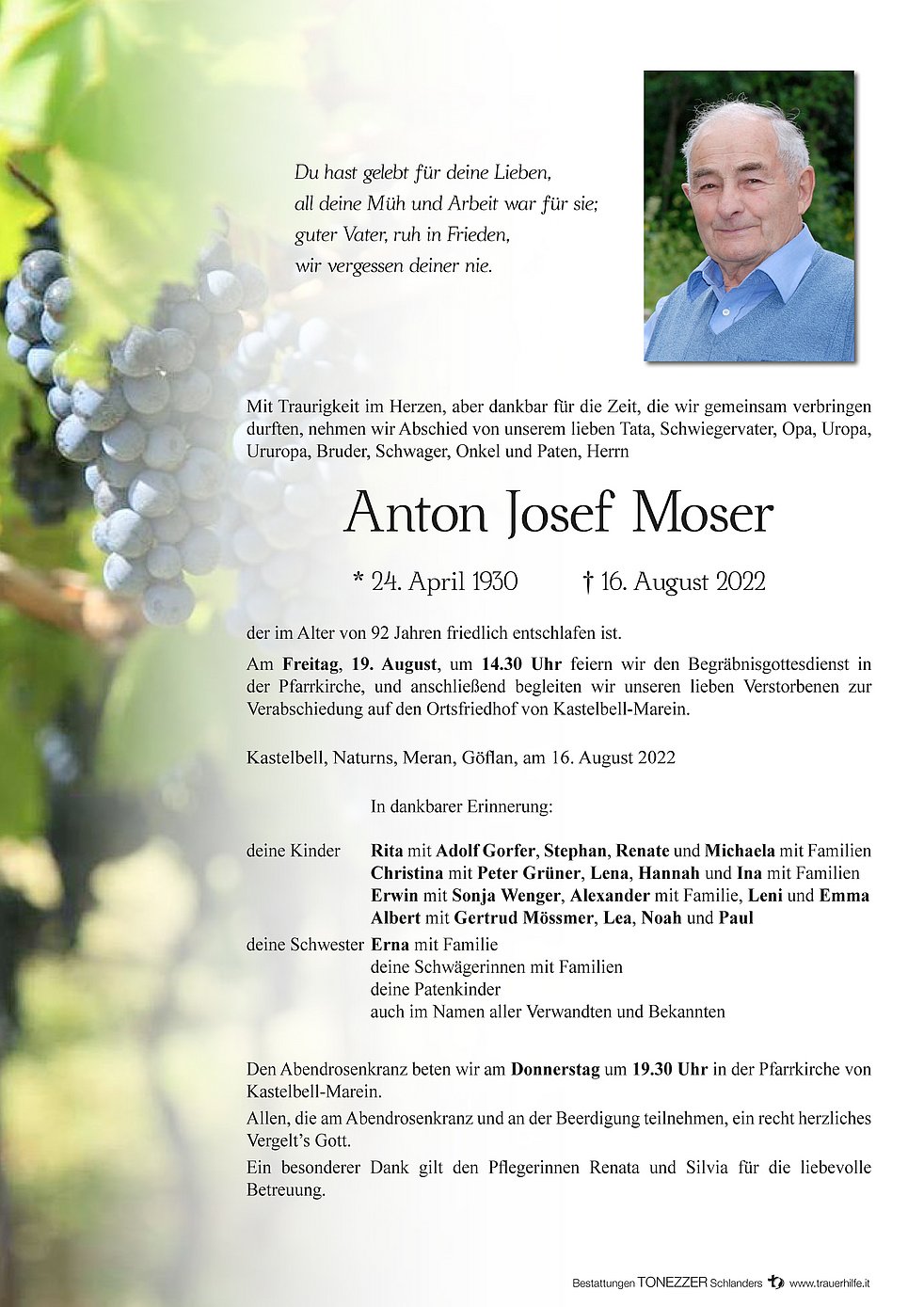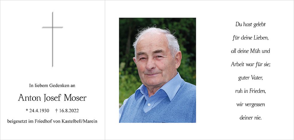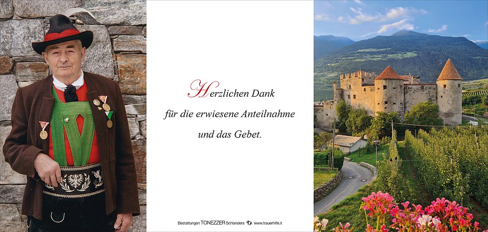 Am Freitag, 19. August, um 14.30 Uhr feiern wir den Begräbnisgottesdienst in der Pfarrkirche, und anschließend begleiten wir unseren lieben Verstorbenen zur Verabschiedung auf den Ortsfriedhof von Kastelbell-Marein.