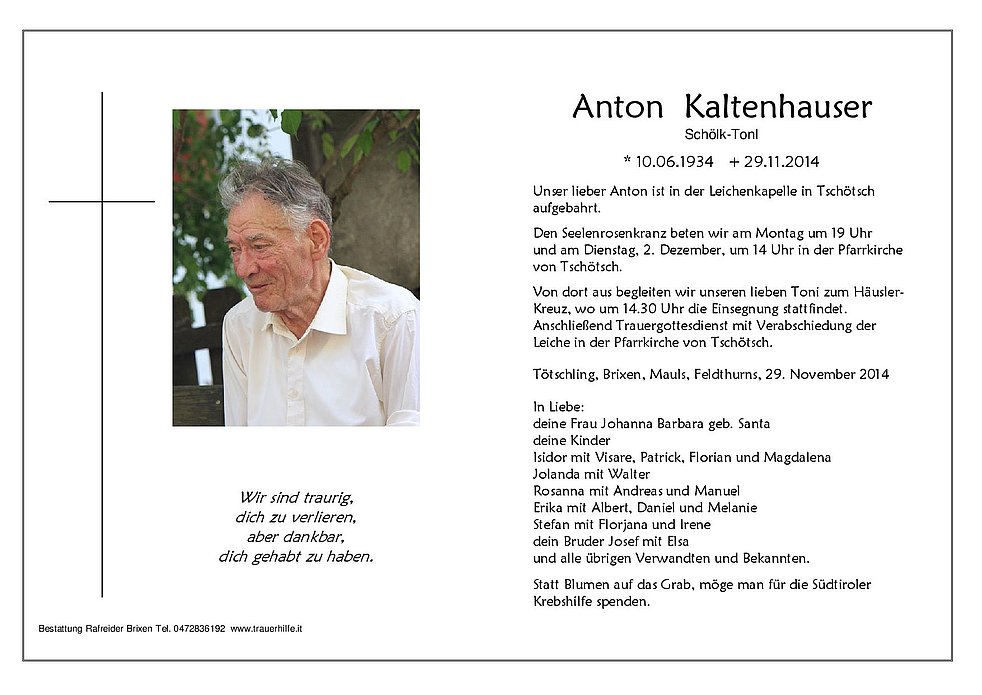 Statt Blumen auf das Grab, möge man für die Südtiroler Krebshilfe spenden.