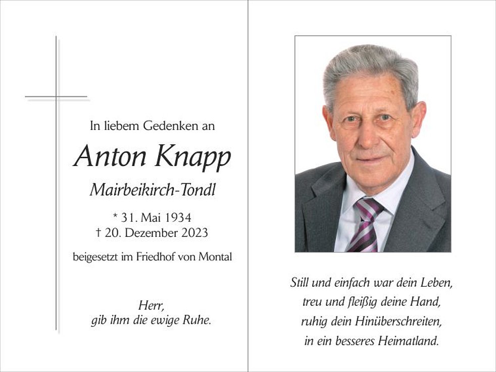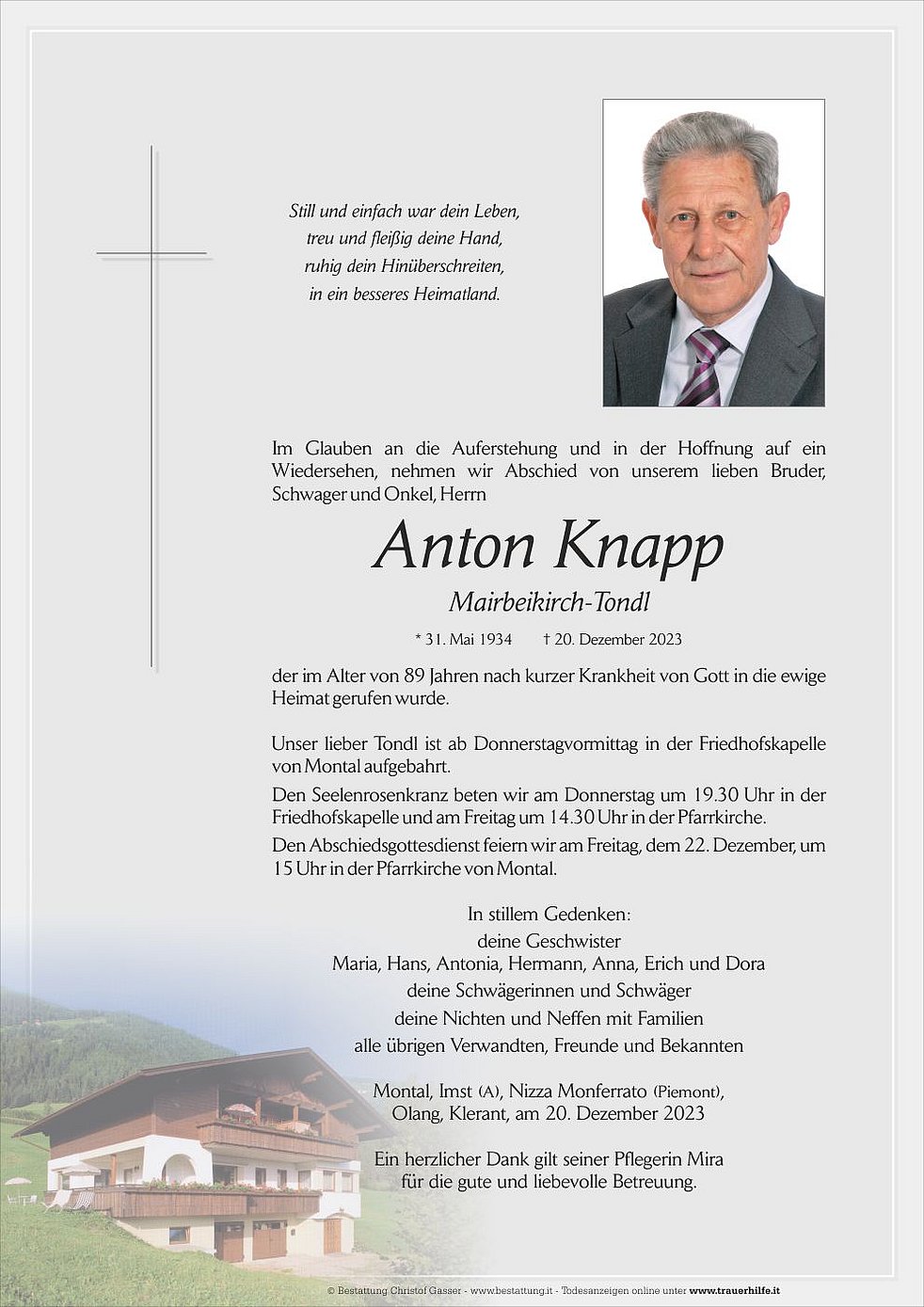 Unser lieber Tondl ist ab Donnerstagvormittag in der Friedhofskapelle von Montal aufgebahrt.