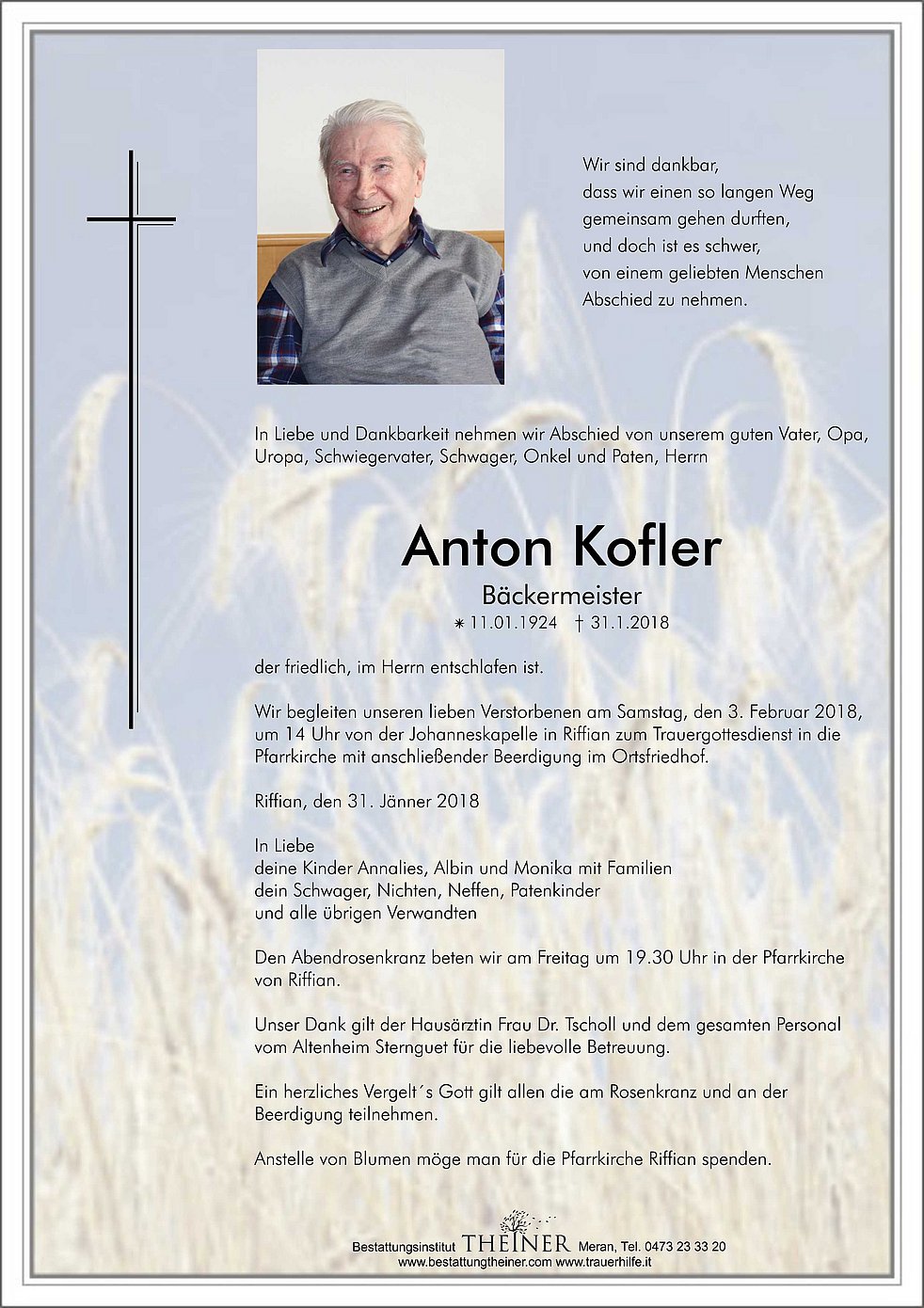 Wir begleiten unseren lieben Verstorbenen am Samstag, den 3. Februar 2018, um 14 Uhr von der Johanneskapelle in Riffian zum Trauergottesdienst in die Pfarrkirche mit anschließender Beerdigung im Ortsfriedhof.