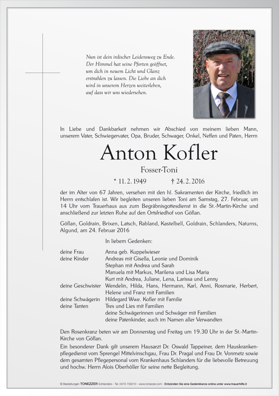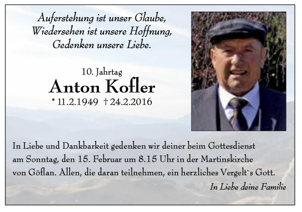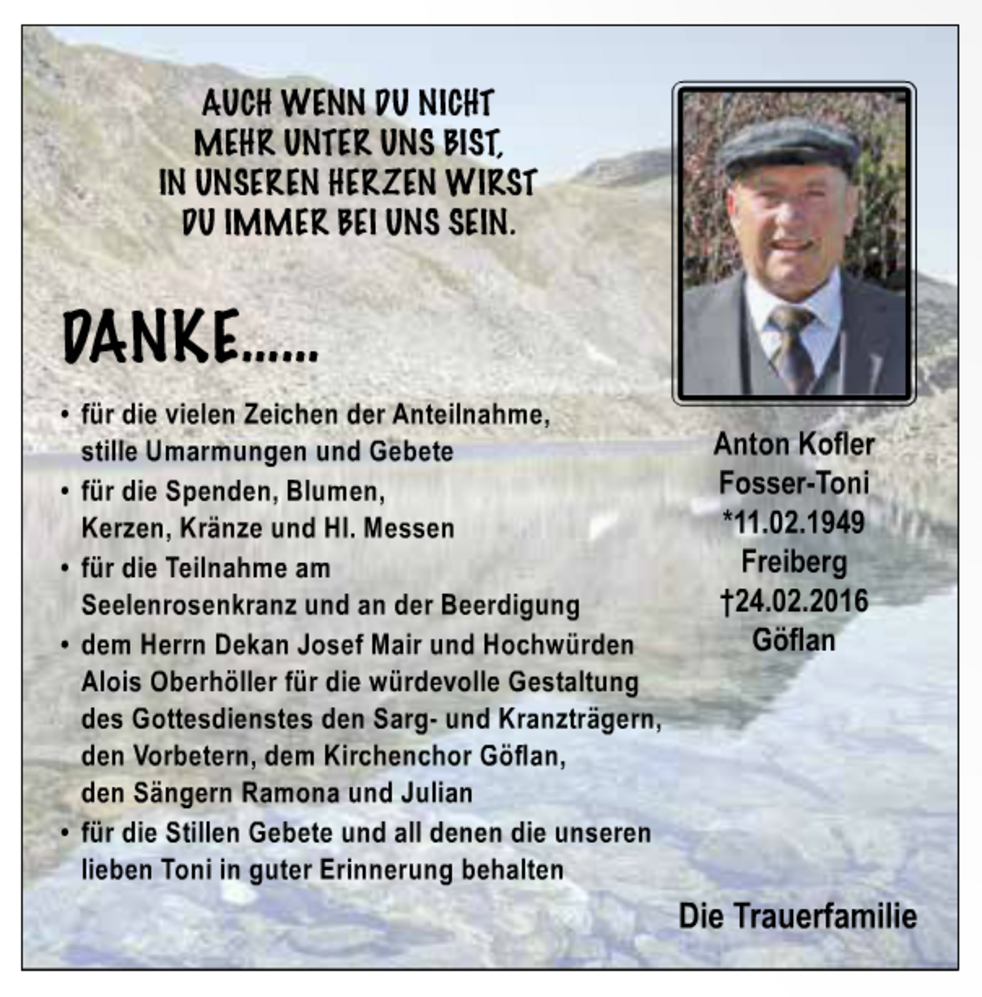Wir begleiten unseren lieben Toni am Samstag, 27. Februar, um 14 Uhr vom Trauerhaus aus zum Begräbnisgottesdienst in die St.-Martin-Kirche und anschließend zur letzten Ruhe auf den Ortsfriedhof von Göflan.