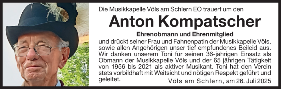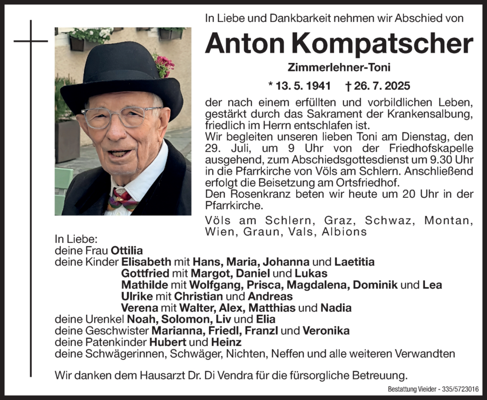 Wir begleiten unseren lieben Toni am Dienstag, den 29. Juli, um 9 Uhr von der Friedhofskapelle ausgehend, zum Abschiedsgottesdienst um 9.30 Uhr in die Pfarrkirche von Völs am Schlern. Anschließend erfolgt die Beisetzung am Ortsfriedhof.