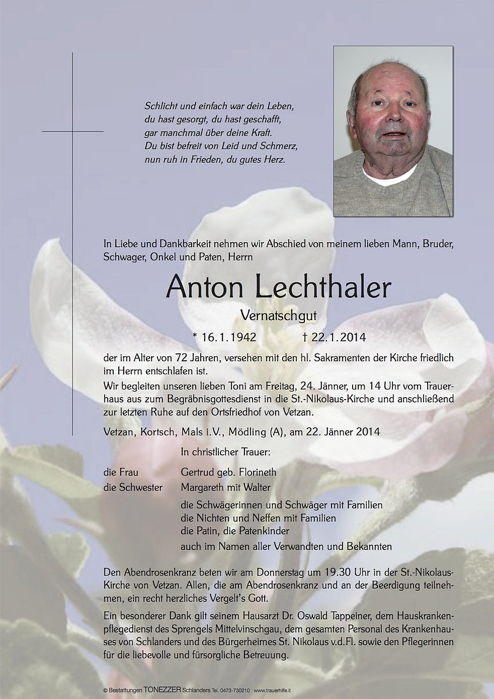 Ein besonderer Dank gilt seinem Hausarzt Dr. Oswald Tappeiner, dem Hauskrankenpflegedienst des Sprengels Mittelvinschgau, dem gesamten Personal des Krankenhauses von Schlanders und des Bürgerheimes St. Nikolaus v.d.Fl. sowie den Pflegerinnen für die liebevolle und fürsorgliche Betreuung.