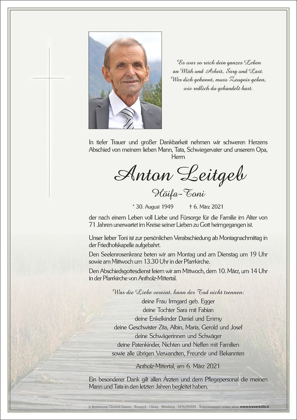 Den Abschiedsgottesdienst feiern wir am Mittwoch, dem 10. März, um 14 Uhr in der Pfarrkirche von Antholz-Mittertal.