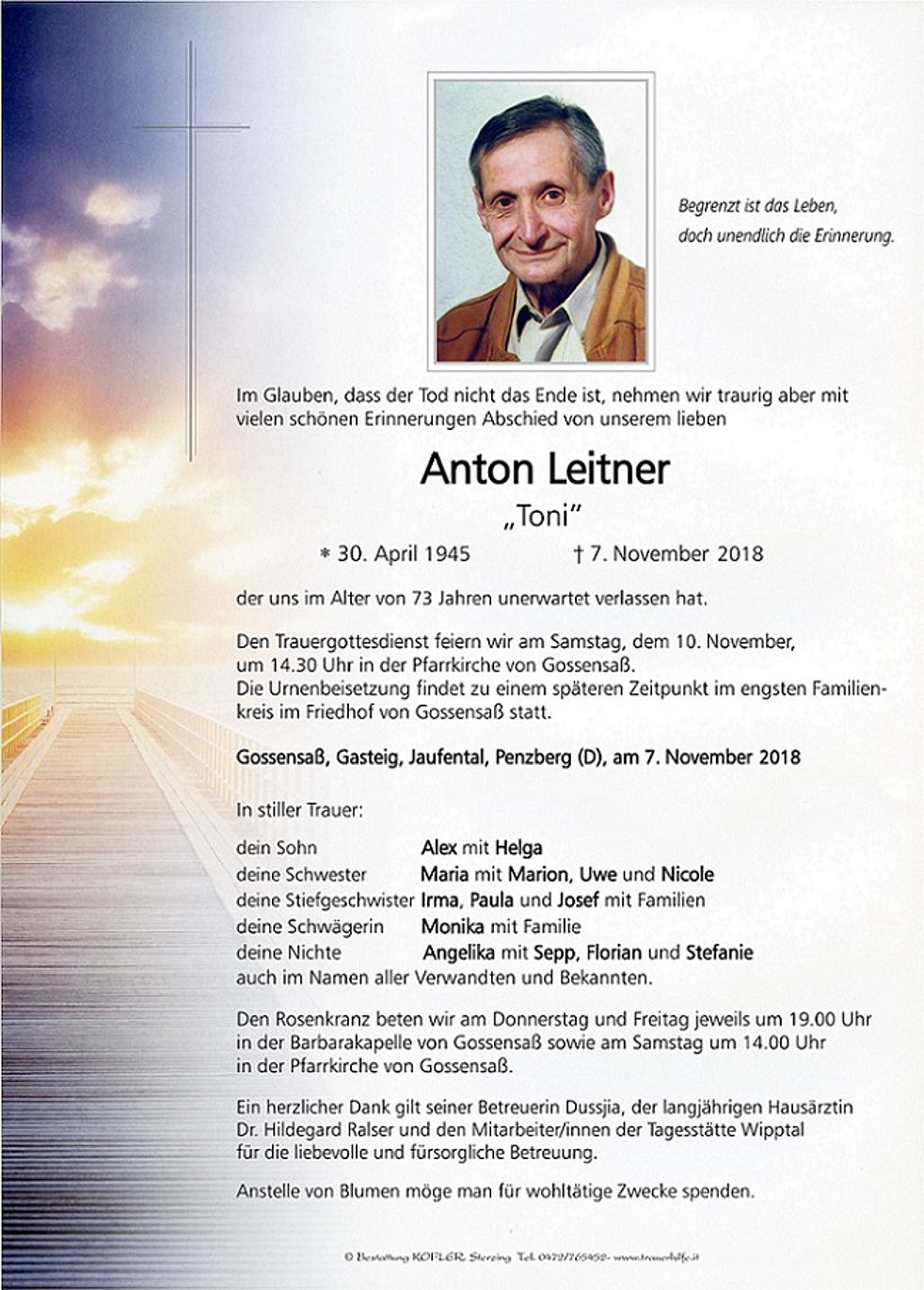 Ein herzlicher Dank gilt seiner Betreuerin Dussjia, der langjährigen Hausärztin Dr. Hildegard Ralser und den Mitarbeiter/innen der Tagesstätte Wipptal für die liebevolle und fürsorgliche Betreuung.
