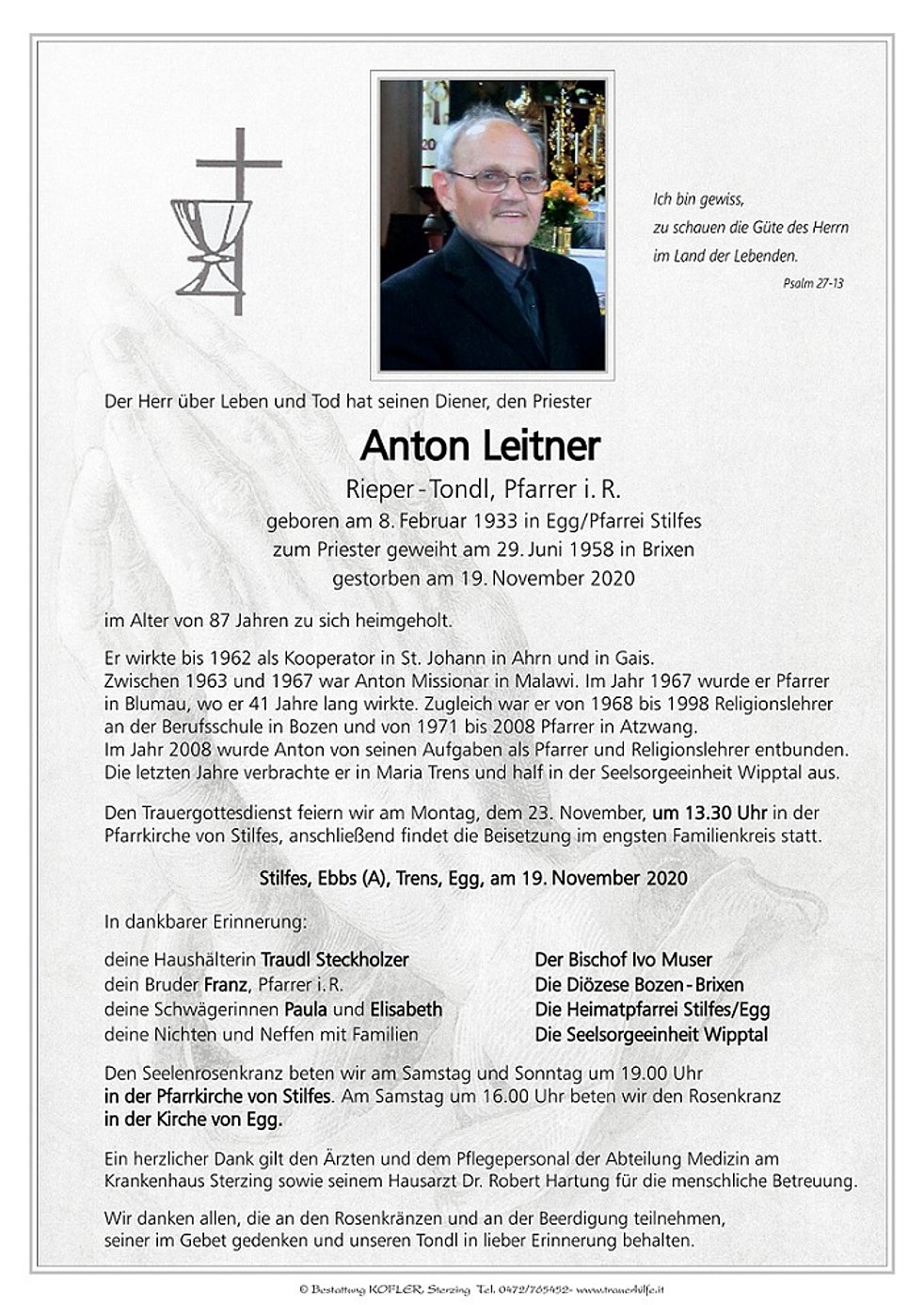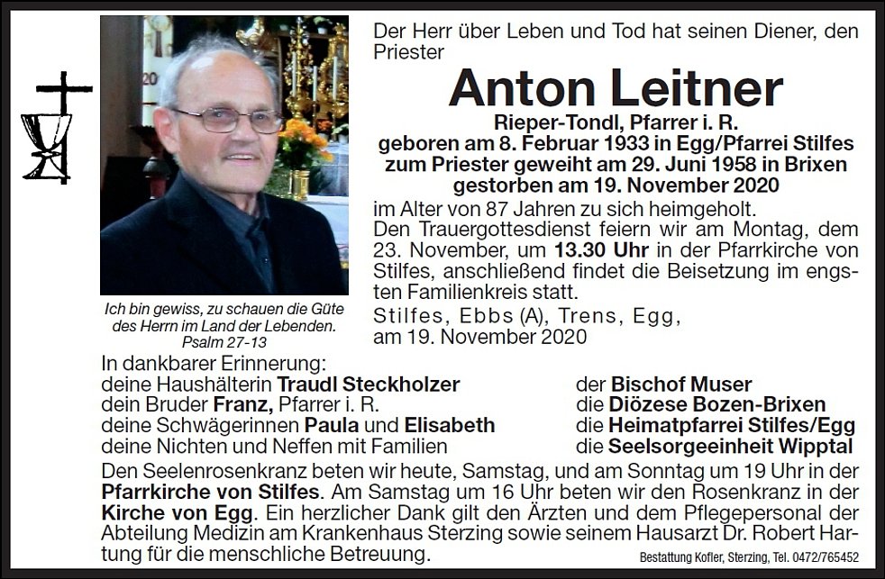 Den Trauergottesdienst feiern wir am Montag, dem 23. November, um 13.30 Uhr in der Pfarrkirche von Stilfes, anschließend findet die Beisetzung im engsten Familienkreis statt.