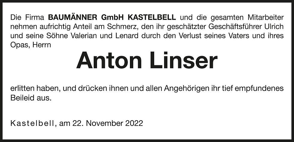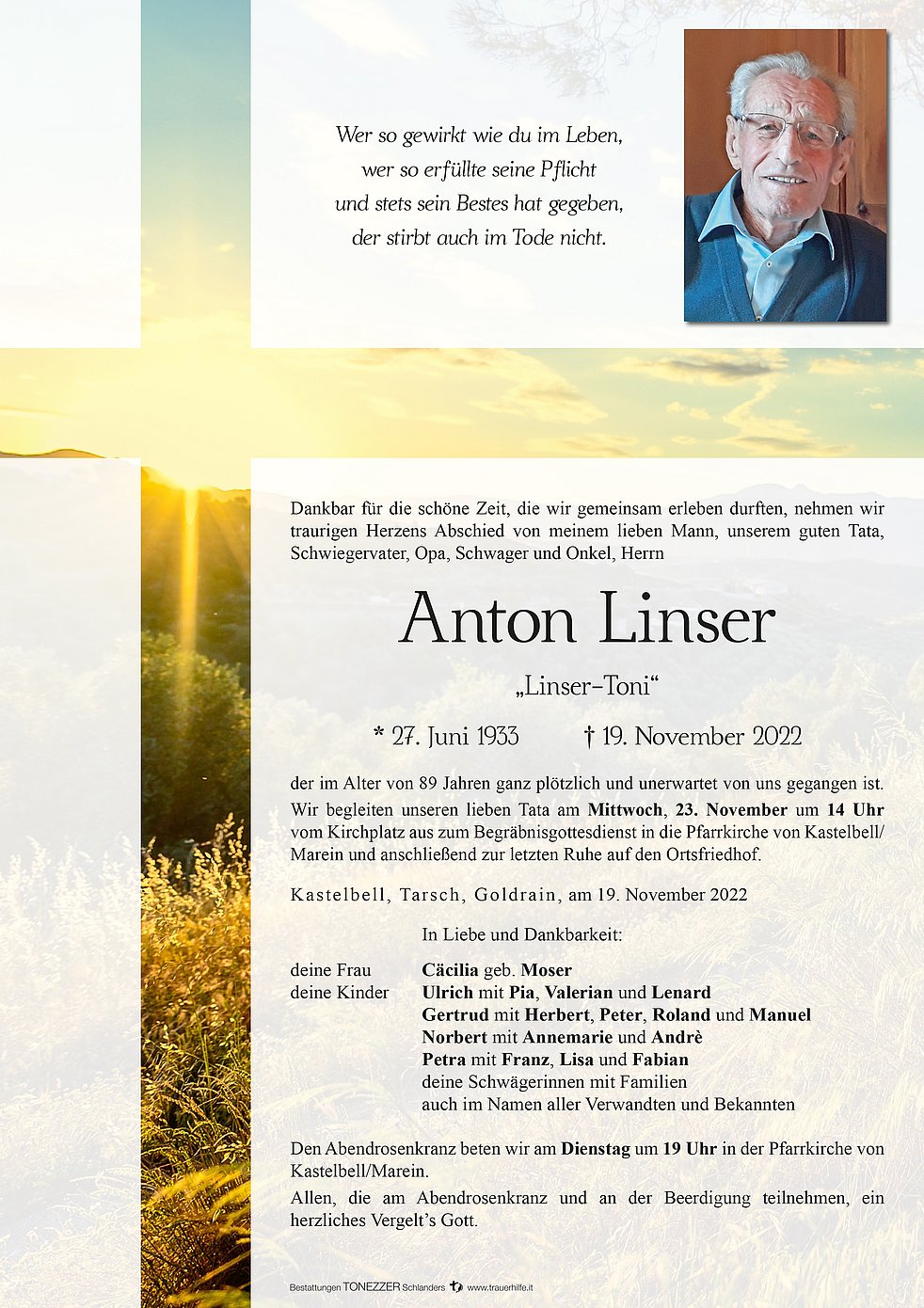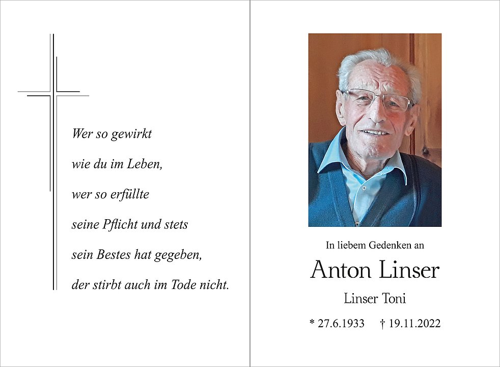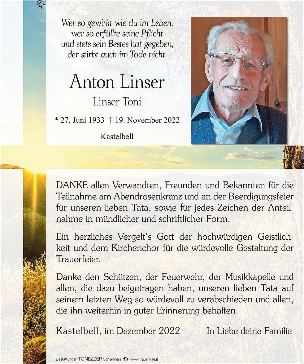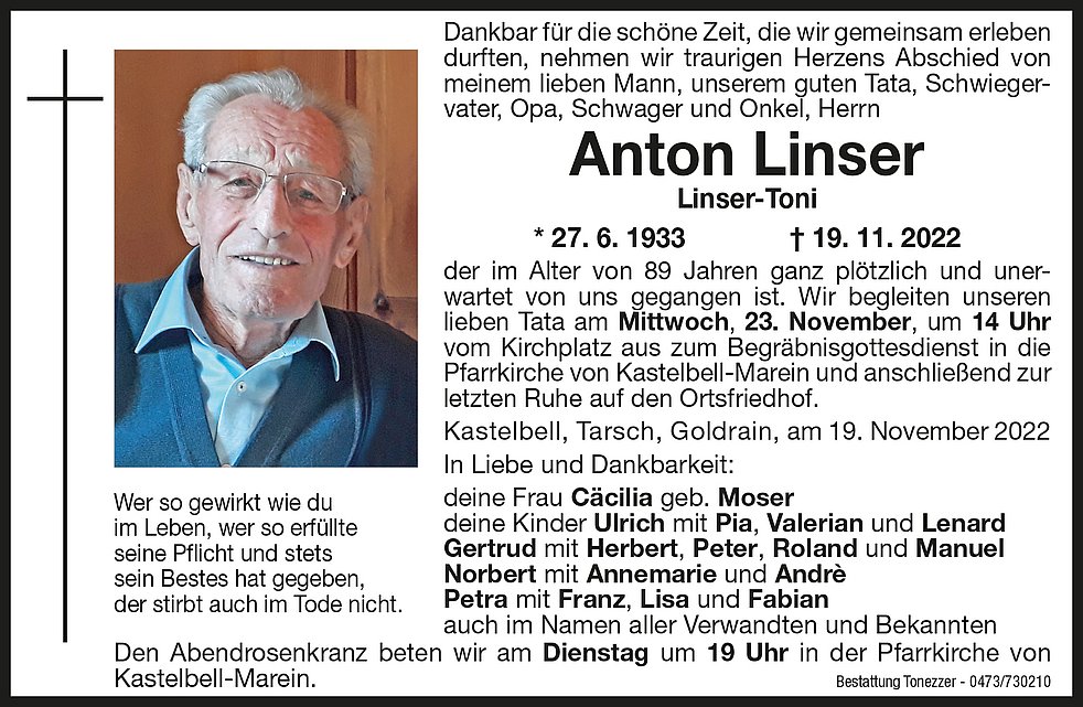 Wir begleiten unseren lieben Tata am Mittwoch, 23. November um 14 Uhr vom Kirchplatz aus zum Begräbnisgottesdienst in die Pfarrkirche von Kastelbell/Marein und anschließend zur letzten Ruhe auf den Ortsfriedhof.