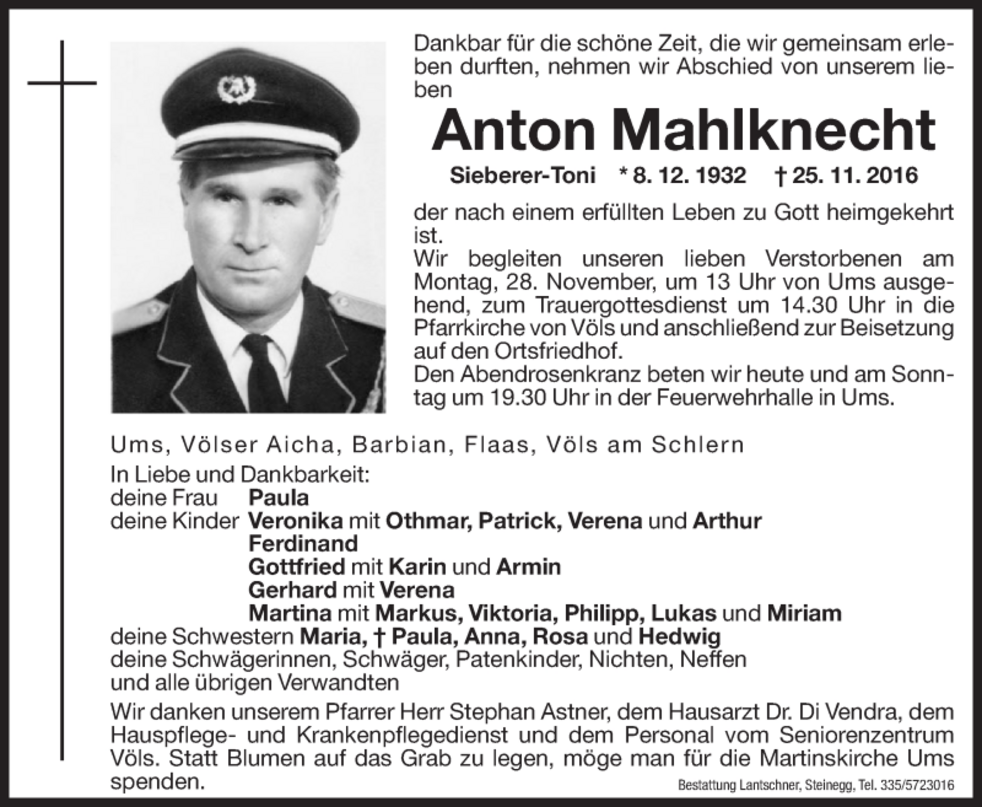 zum Trauergottesdienst um 14.30 Uhr in die Pfarrkirche von Völs und